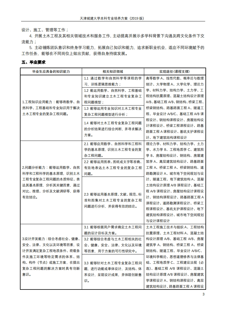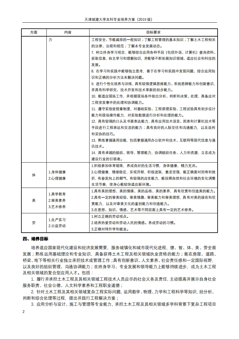 天津城建大学本科专业培养方案(2019版)土木工程专业培养方案一、专业名称及代码中文:土木工程英文:Civil Engineering代码:081001二、专业简介土木工程专业是天津城建大学的骨干专业和最早的办学专业之一,自1978年开始招收本科生。2000年被确定为天津市重点建设专业;2007年被评为国家特色专业;2009年和2014年分别通过住建部专业评估和复评;2010年被评为天津市品牌专业;2011年列入教育部卓越工程师教育培养计划;2012年获批天津市级专业综合改革试点专业;2013年获批教育部高等学校专业综合改革试点专业;2017年被确立为天津市优势特色专业;2019年被确立为天津市一流专业。土木工程一级学科为天津市级重点学科和天津市一流学科,拥有天津市重点实验室(2个)、教育部工程研究中心、天津市工程中心、国家级产学研实践基地等创新与实践平台,拥有4支天津市教学团队、2支天津市高校创新团队、1个天津市土木工程实验教学示范中心,为专业建设和发展提供了全面支持。土木工程专业包含建筑工程、道路与桥梁工程、地下结构工程三个专业方向。三、专业标准方面内容目标要求1道德修养1具有高尚的道德品质和社会责任感,能体现哲理、情趣、品味、人格等方面的2.民族精神较高修养:德3理想信念2具有求真务实的科学态度以及实干创新的精神,树立科学的世界观和正确的人4.人际交往生观,遵守职业操守,愿为国家富强、民族振兴服务:5.国际视野3具有宽广的国际视野和跨文化思考与包容、合作与竞争能力;6.团队合作4.富于团队合作精神,并在团队中很好地发挥作用。1数学知识1.熟练掌握高等数学和工程数学相关知识。2.自然科学知识2.了解现代物理、化学的基本知识,了解自然科学发展的主要趋势和应用前景。3人文科学知识3.熟悉哲学、政治、历史、文学等方面的基本知识,了解艺术、法律、伦理、4.专业知识社会学和公共关系等方面的基础知识,并对其中的若干方面有深入的修习。5.为专业服务的其他知4.熟练掌握理论力学、材料力学、结构力学、流体力学基本原理和分析方法;识掌握工程材料的基本性能和使用条件,掌握工程测量基本技能:掌握工程图学6.国内外前沿进展知识的基本理论及CD绘图技术;掌握工程结构构件的力学性能和计算原理;掌握7终身学习能力土力学和基础工程设计的基本原理和分析方法;掌握土木工程施工与组织、项8发现问题、分析问目管理以及技术经济分析的基本方法:掌握工程项目的勘测、规划、选型的基本题、解决问题的能力知识和方法:掌握工程结构设计的基本原理和设计方法:掌握现代施工技术、工9逻辑思维能力程检测与试验的基本技能:熟悉专业软件应用技术:了解土木工程防灾与减灾10.现场工作能力的基本原理及一般方法。11.实验室工作能力5.掌握为专业服务的其他知识,掌握一门外语,并具有一定的外文写作和表达12.表达、交流能力能力:掌握计算机基本知识、高级编程语言和土木工程专业软件;了解信息科学13.通用技能(通用办公基本知识,掌握文献、信息、资料检索的一般方法。技术、信息与通讯等)6.了解相关领域知识:了解建筑、规划、建筑设备(给排水、供热通风与空调,14.组织、领导和管理能建筑电气等)、交通工程的基本知识;了解土木工程与可持续发展的关系:了解