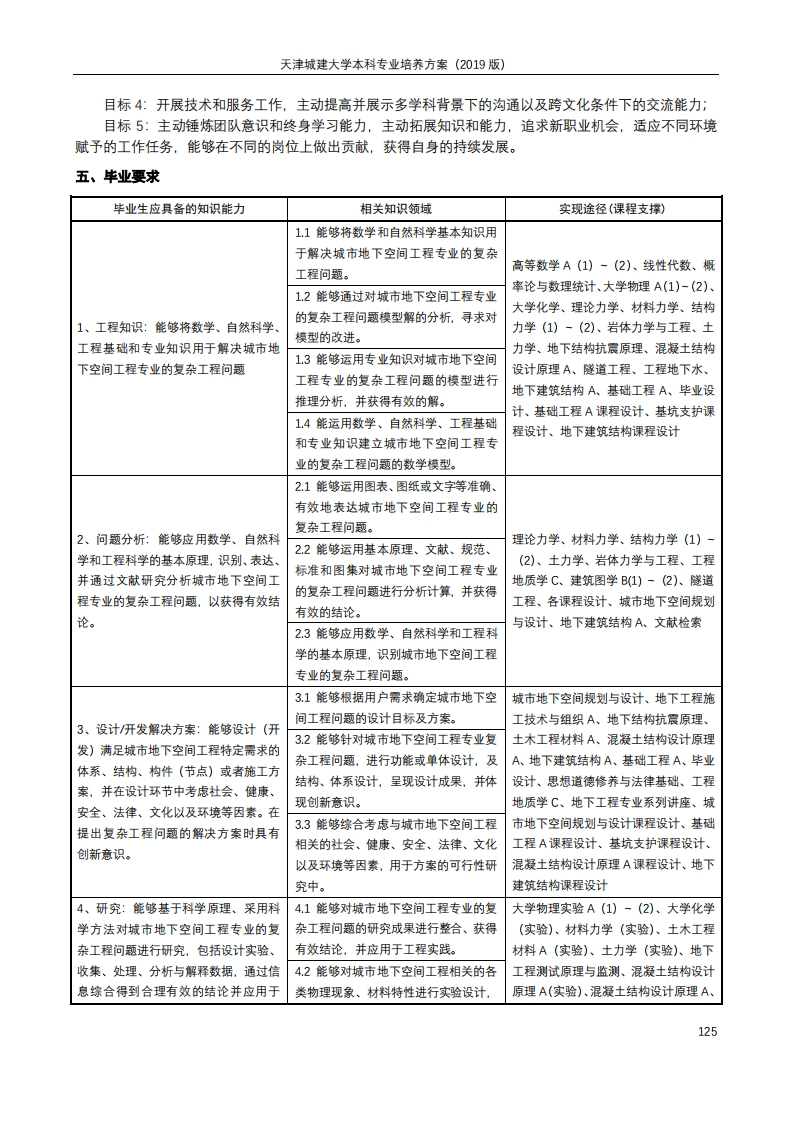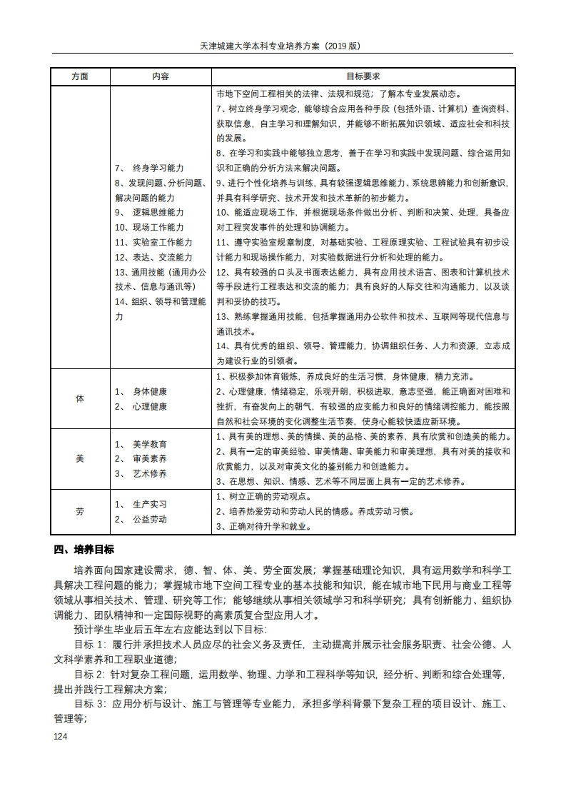 天津城建大学本科专业培养方案(2019版)城市地下空间工程专业培养方案一、专业名称及代码中文:城市地下空间工程英文:City Underground Space Engineering代码:081005T二、专业简介城市地下空间工程专业是为解决城市地铁建设,高层建筑地下空间开发等而创办的新兴交叉专业,是在天津市岩土工程重点学科和结构工程重点学科的基础上派生出来的,2008年,获批设立,并于次年招生。2011年获批“天津市战略性新兴产业相关专业",列入天津市"卓越人才培养计划专业"。2017年获批“天津市应用型专业”。现依托天津市土木工程一流学科,拥有四个国家级与省部级的科研机构和一个国基合作基地(吹填造陆与滨海软土工程技术教育部工程研究中心、天津市软土特性与工程环境重点实验室、地质环境与岩土工程联合研究中心、建筑固体废弃物资源化利用国家地方联合工程研究中心、防护技术与绿色环境生物技术国际联合研究中心),1支天津市教学团队,并与中铁十八局集团、天津勘察院等建立了良好的产学研合作基地,为专业建设和发展提供了全面支持。三、专业标准方面内容目标要求1、道德修养1、具有深厚的爱国情怀、高尚的道德品质和社会责任感,】能体现哲理、情趣2、民族精神品味、人格等方面的较高修养;德3、理想信念2、具有求真务实的科学态度以及实干创新的精神,树立科学的世界观和正确的4、人际交往人生观,遵守职业操守,愿为国家富强、民族振兴服务;5国际视野3、具有宽广的国际视野和跨文化思考与包容、合作与竞争能力;6、团队合作4、富于团队合作精神,并在团队中很好地发挥作用。1、熟练掌握高等数学和工程数学相关知识。2、了解现代物理、化学的基本知识,了解自然科学发展的主要趋势和应用前景。3、熟悉哲学、政治、历史、文学等方面的基本知识,了解艺术、法律、伦理、社会学和公共关系等方面的基础知识,并对其中的若干方面有深入的修习。4、熟练掌握理论力学、材料力学、结构力学基本原理和分析方法;掌握工程材1、数学知识料的基本性能和使用条件,掌握工程测量基本技能;掌握工程图学的基本理论2、自然科学知识及CAD绘图技术;掌握工程结构构件的力学性能和计算原理;掌握土力学和基3、人文科学知识础工程设计的基本原理和分析方法;掌握城市地下空间工程施工与组织、项目4、专业知识管理以及技术经济分析的基本方法;掌握工程项目的勘测、规划、选型的基本智5、为专业服务的其他知知识和方法;掌握工程结构设计的基本原理和设计方法;掌握现代施工技术、识工程检测与试验的基本技能;熟悉专业软件应用技术;了解城市地下空间工程6、国内外前沿进展知识防灾与减灾的基本原理及一般方法。5、掌握为专业服务的其他知识,掌握一门外语,并具有一定的外文写作和表达能力;掌握计算机基本知识、高级编程语言和城市地下空间工程专业软件;了解信息科学基本知识,掌握文献、信息、资料检索的一般方法。6、了解相关领域知识:了解建筑、规划、建筑设备(给排水、供热通风与空调、建筑电气等)、交通工程的基本知识;了解城市地下空间工程与可持续发展的关系;了解工程安全、节能减排的一般知识;了解工程管理的基本知识;了解城123