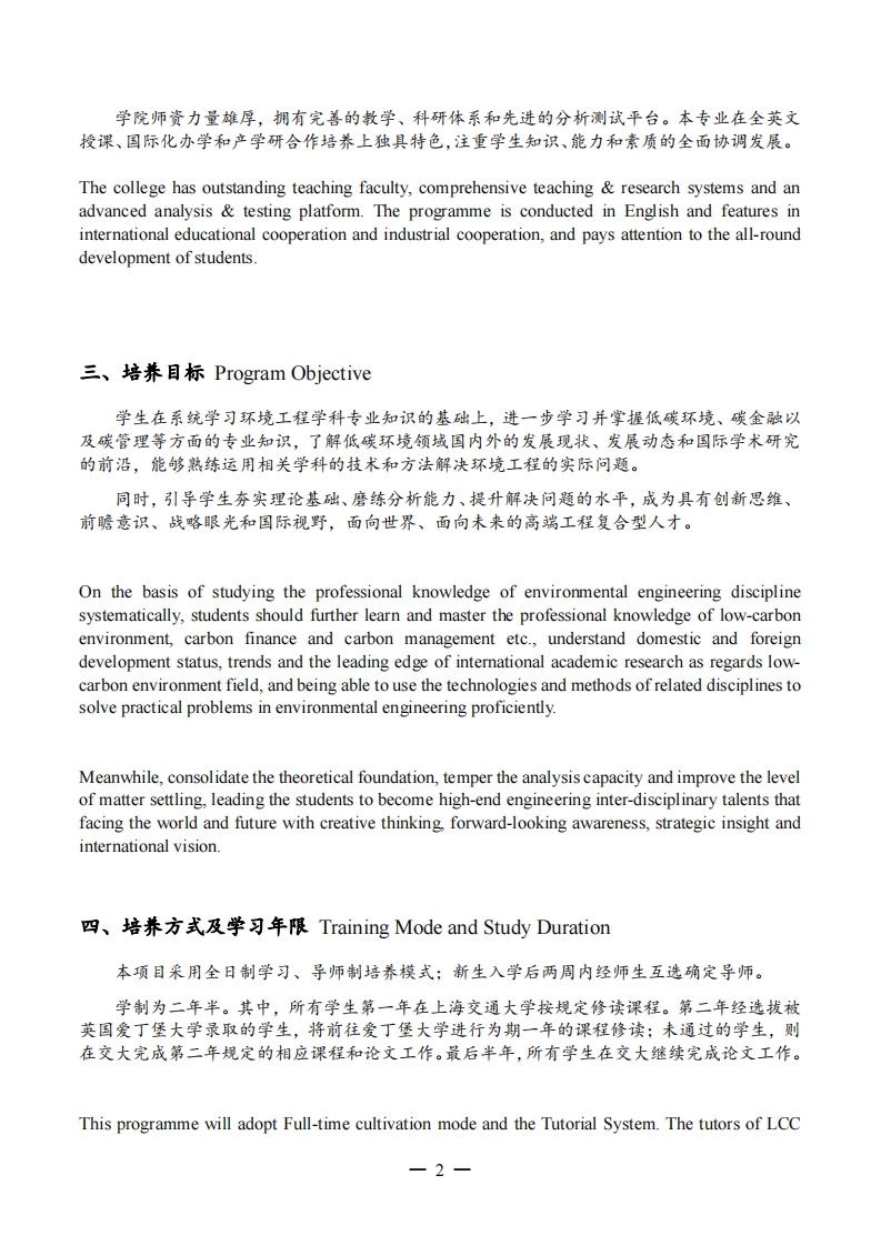 (085700)环境科学与工程学科2023级全日制硕士研究生培养方案2023 Full-time Master Program for Environmental Science and Engineering一、基本信息Basic Information院系名称中英国际低碳学院造用年级SchoolChina-UK Low Carbon College2023级ClassGrade适用专业资源与环境(低碳环境方向)标准学制MajorResource and Environment (Low CarbonDuration2.5年YearsEnvironment)学习形式Study Mode全日制Full time项目类型专业型ProfessionalProgram Type培养层次硕士生Master StudentProgram Level最低学分30最低GPA学分19最低GPA2.7Min CreditMin GPA CreditMin GPA二、专业领城简介Introduction全球气候变化深刻影响着人类的生存和发展,是各国共同面临的重大挑战。资源与环境(低碳环境方向)专业旨在通过技术、行政、市场等手段,加快推进绿色低碳发展进程,解决温室气体及相关污染物排放过量等问题,增强人类应对气候变化的能力。本专业与化学、生物学以及社会学等多学科相交叉,以相关环境问题为研究对象,利用有关基础学科的原理、方法和工程技术实施具体的规划、管理和工程措施,实现自然资源合理利用、清洁生产、废物资源化与能源化、污染防治、环境保护和质量改善,为社会、经济和环境的可持续发展提供支撑。Global climate change has a profound impact on human survival and development,and is a majorchallenge for all countries.The resources and environment programme (low carbon environmentdirection)aims to speed up the process of green and low carbon development,solve the problem ofexcessive emission of greenhouse gases and related pollutants,and enhance human's ability to copewith climate change by means of technology,administration,market and other means.This major isinterdisciplinary with chemistry,biology,sociology and other disciplines,taking relevantenvironmental issues as research objects,and using the principles,methods and engineeringtechnologies of relevant basic disciplines to implement specific planning,management andengineering measures,so as to realize the rational use of natural resources,clean production,wasteresource and energy,pollution prevention and control,environmental protection and qualityimprovement,provide support for the sustainable development of society,economy and environment.