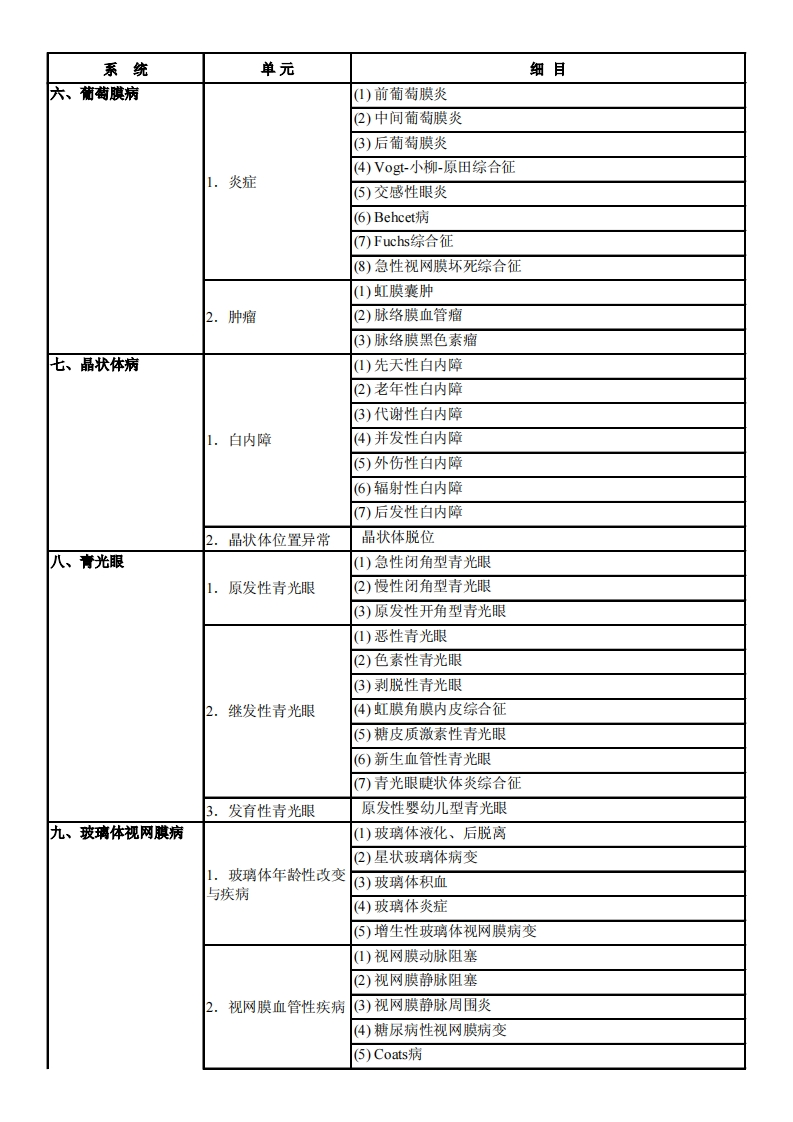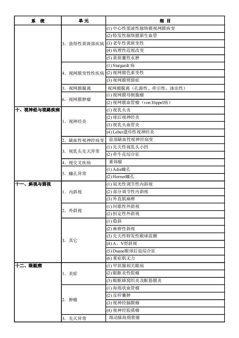 334眼科学考试大纲一专业实践能力系统单元细目一、眼脸病(1)睑腺炎(2)睑板腺囊肿1.炎症(3)睑缘炎(4)带状疱疹性眼睑炎(1)睑内翻2.位置异常(2)眼睑外翻(3)上睑下垂3.先天异常内眦赘皮(1)眼睑血管瘤4.肿瘤(2)眼睑基底细胞癌(3)睑皮脂腺癌二、泪器病1.泪道疾病慢性泪囊炎2.泪腺疾病泪腺混合瘤三、结膜病(1)淋菌性结膜炎2)急性卡他性结膜炎(3)沙眼1.结膜炎(4)流行性角结膜炎(⑤)出血性结膜炎(6)春季角结膜炎(7)泡性结膜炎()翼状胬肉2.变性(2)睑裂斑()皮样脂肪瘤3.肿瘤(2)色素痣四、角膜病()细菌性角膜炎(2)真菌性角膜炎1.炎症(3)单疱病毒性角膜炎(4)蚕蚀性角膜溃疡(1)边缘性角膜变性2.变性与营养不良(2)几种常见的角膜营养不良(3)大泡性角膜病变3.肿瘤角膜皮样瘤4.其它(1)角膜软化症2)圆锥角膜五、巩膜病()结节性巩膜炎1.表层巩膜炎(2)周期性巩膜炎(1)前巩膜炎2.巩膜炎(2)后巩膜炎(3)坏死性巩膜炎