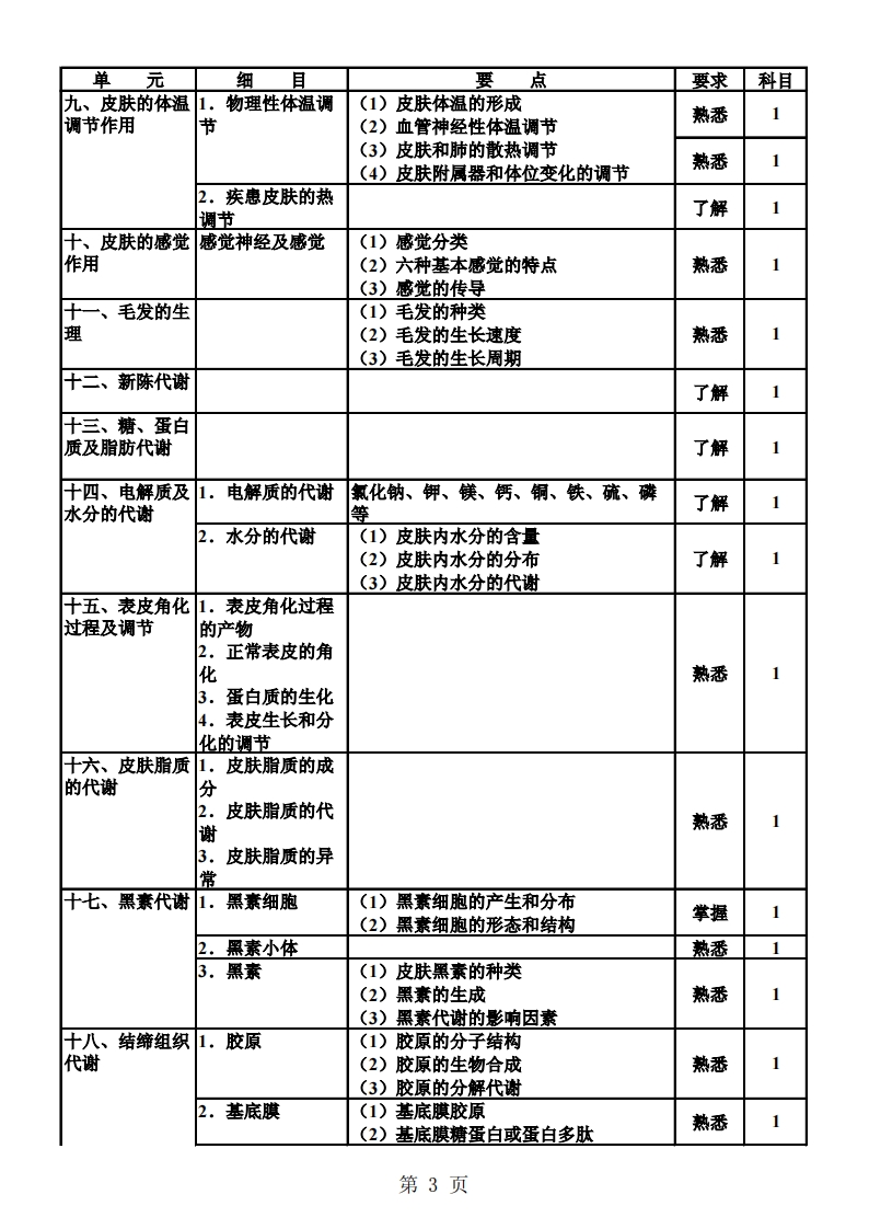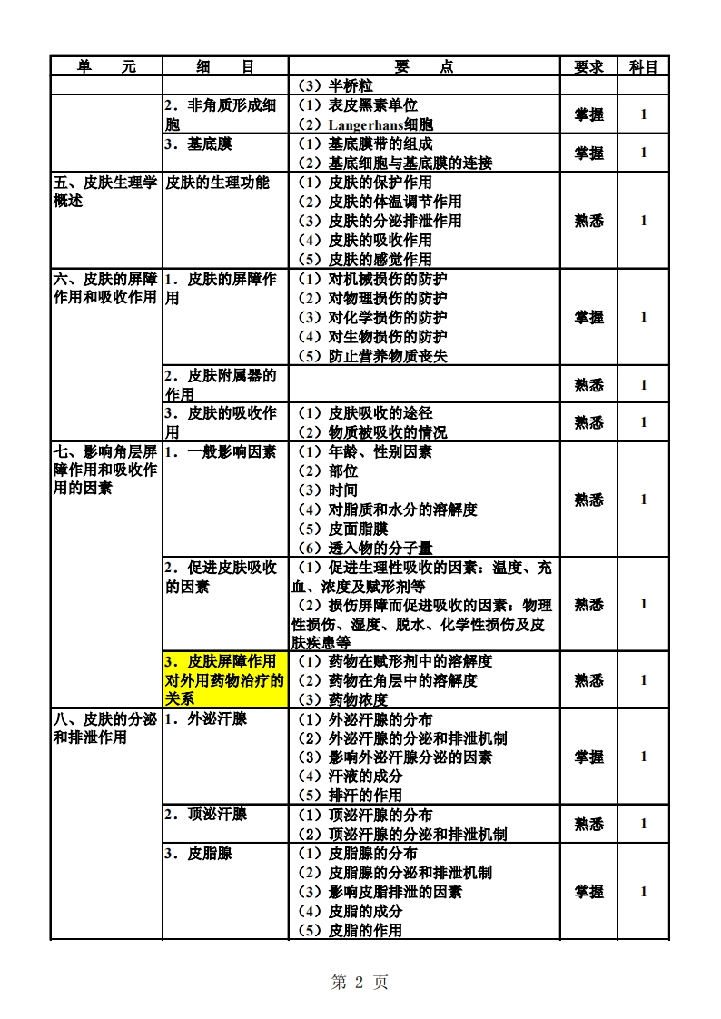 338皮肤与性病学考试大纲①一基础知识;②-相关专业知识;⑧专业知识单元细目要点要求科目、皮肤解剂学1.概述(1)皮肤的组成(2)皮肤的重量(3)皮肤的面积掌握1(4)皮肤的厚度(5)皮嵴、皮沟及皮野2。皮肤的肌肉(1)横纹肌分布及功能1(2)平滑肌分布及功能熟悉3.毛发分布及功能掌握14,皮脂腺分布及功能掌握15.汗腺(1)顶泌汗腺分布及功能(2)外泌汪腺分布及功能掌握16.甲甲的结构及功能熟悉二、皮肤胚胎学皮肤的发生()中胚层发生的皮肤组织(2)外胚层发生的皮肤组织了解1三、皮肤组织学1.表皮(1)角质形成细胞和非角质形成细胞(2)角化过程和表皮通过时间掌握1(3)角质形成细胞的功能(4)黑素细胞、Langerhans细胞和Merkel细胞2.真皮与表皮交(1)真皮乳头界处(2)表皮突掌握1(3)基底膜带3.真皮真皮的组成及各组成部分的功能掌握14.皮下脂肪组织构成及功能熟悉15。皮肤附属器(1)组成(2)毛囊的结构(3)皮脂腺的结构(4)全分泌腺1(5)顶泌汗腺的结构熟悉(6)顶浆分泌(7)外泌汗腺的结构(8)指甲的结构6,皮肤的血管皮肤的血管丛熟悉1.皮肤的淋巴管组成及功能熟悉】8.皮肤的神经了解19.口唇、生殖器(1)口唇及粘膜移行部位皮(2)阴茎、包皮、龟头熟悉1肤的组织学(3)阴蒂、阴唇四、皮肤的超微1.表皮细胞间的(1)角蛋白细丝结构联系(2)桥粒掌握第1页
