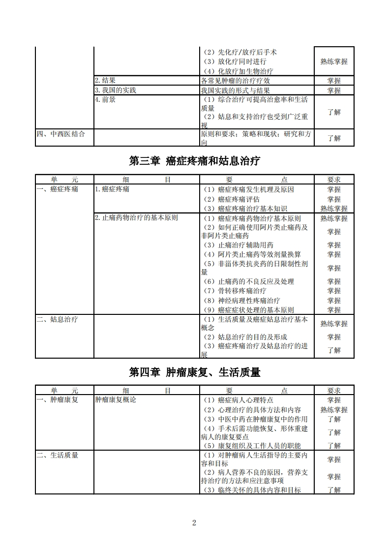 341-343肿瘤学考试大纲基础知识第一章临床肿瘤学概论单元细要点要求一、历代对肿瘤的1.肿瘤发生的情况及近代肿瘤学(1)肿瘤的发生情况(肿瘤死亡增了解认识的基本观点加的原因)(2)常见肿瘤的发生情况及动态变化1)世界癌症死亡的主要原因及各种肿瘤发病率的变化掌握2)我国主要死亡原因及发病率有变化的肿瘤掌握2.不同时代对肿瘤的认识(1)对肿瘤生物化学的认识(2)对肿瘤的免疫学认识掌握(3)对肿瘤的分子水平、基因水平的认识3.肿瘤的诊断及鉴别诊断病理学及细胞学在诊断中的价值掌握、临床肿瘤学的1.肿瘤病因(1)物理因素(吸烟、射线等)特点(2)化学因素掌握(3)生物因素(4)内分泌、免疫、遗传2.肿瘤的形成和发展(1)肿瘤是由机体细胞而来(2)肿瘤形成过程及特征掌握(3)肿瘤的形成中内因的作用(4)肿瘤在临床上不同表现3.肿瘤分期与诊断和治疗的关系(1)癌症的TNM的定义(2)T,N,M和/或PT,PN,PM的分期依据(3)TNM临床分期(4)组织病理学分级熟练掌握(5)其他分期形式(小细胞肺癌,淋巴瘤,多发性骨髓瘤)(6)其他补充项目标志第二章肿瘤综合治疗的策略和计划单元细且要点要求、策略1.历史和定义综合治疗的定义熟练掌握2.现状各种肿瘤的常规治疗的变化趋势掌握3.原则和计划(1)综合治疗的原则(2)目的明确熟练掌握(3)安排合理二、组织1.组成综合治疗组的组成结构了解2.各学科的任务各学科的地位与角色了解三、模式1.常见的各种模式(1)传统模式(术后放化疗)熟练掌握