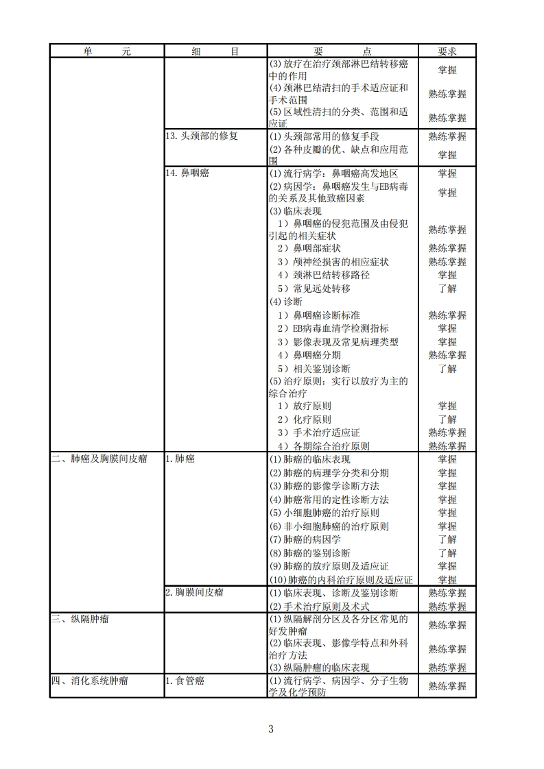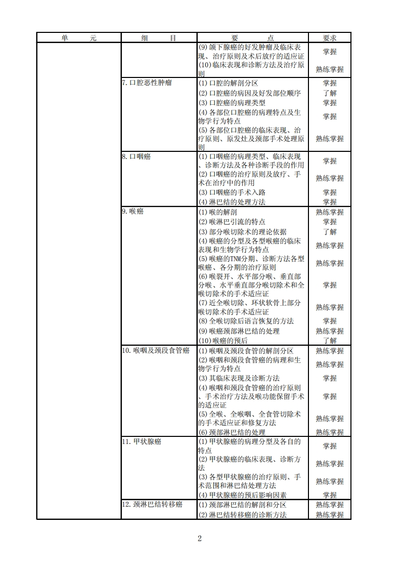 342肿瘤外科学专业知识单元细且要点要求、头颈部肿瘤1.头颈部肿瘤总论(1)头颈肿瘤的范围和相关解剖了解(2)头颈肿瘤的发病情况掌握(3)头颈肿瘤病理的多样性掌握(4)头颈肿瘤的诊断方法及TM分期掌握(⑤)头颈肿瘤的治疗原则熟练掌握(6)各种治疗手段在头颈肿瘤治疗中的作用掌握(7)头颈肿瘤的治疗进展和新方法掌握(8)头颈肿瘤的预后情况熟练掌握2.眼部肿瘤(1)眼部肿瘤的病理类型了解(2)眼睑基底细胞癌、睑板腺癌、眼睑鳞癌好发部位和临床表现掌握(3)眼部肿瘤的治疗原则熟练掌握3.耳部及颞骨肿瘤(1)耳部及颞骨恶性肿瘤的发病情况和常见病理类型了解(2)临床表现和各种诊断手段的应用掌握(3)治疗原则熟练掌握4.鼻腔及鼻窦恶性肿瘤(1)鼻腔及鼻实肿瘤的病理类型,各病理类型肿瘤的好发部位、生物掌握学行为特点(2)鼻腔和鼻窦恶性肿瘤的临床表现熟练掌握(3)通过临床表现肿瘤的侵犯范围掌握(4)各种诊断手段的应用掌握(⑤)各病理类型肿瘤的治疗原则熟练掌握(6)眶内容的处理原则熟练掌握(7)影响鼻腔鼻实癌预后的因素了解5.颌骨恶性肿瘤(1)颌骨肿瘤的病理类型了解(2)常见病理类型的发病特点、临床表现及X线征象了解(3)颌骨肿瘤的治疗原则及各治疗手段在治疗中的作用掌握(4)颌骨肿瘤的预后情况了解6.涎腺恶性肿瘤(1)大、小涎腺的组成与分布了解(2)小涎腺的分布与病理类型了解(3)涎腺的病理类型了解(4)各涎腺的好发肿瘤掌握(⑤)腮腺的好发肿瘤及临床表现掌握(6)腮腺癌的诊断方法掌握(7)腮腺癌的治疗原则及原发灶手术范围和颈清扫的适应证熟练掌握(⑧)面神经处理原则及术后放疗的话应证掌握