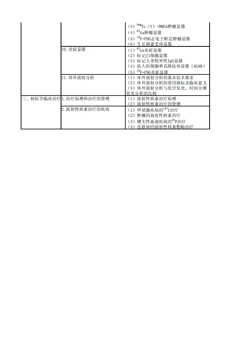 345核医学考试大纲专业实践能力系统单元细目一、核仪器、放射1.核医学仪器(1)核医学射线测量仪器性药物及放射防护(2)Y照相机和单光子发射计算机断层(SPECT)(3)正电子发射计算机断层仪(PE)2.电子计算机在核医学中的应用图像的采集和处理3.核化学与放射性药物(1)放射性碘、镓、铟、铊的放射性药(2)放射性治疗药物4.放射卫生防护核医学实验室二、核医学临床诊1.神经系统(1)脑灌注显像断(2)PET脑代谢显像(3)脑受体显像(4)脑脊液间隙显像(5)脑肿瘤显像2.循环系统(1)首次通过法心室造影(2)平衡法心室造影(3)心肌灌注显像(平面及断层)(4)心肌受体显像(5)介入试验(6)PET心肌显像(7)放射性核素静脉显像(8)相关影像学临床价值比较3.消化系统(1)消化道动力学研究(2)消化道出血显像(3)异位胃黏膜显像(4)肝胆系显像(5)肝脏肿瘤的核医学影像诊断(6)消化系统核医学中的非影像学方法4.呼吸系统(1)肺功能测定与肺功能显像(2)肺灌注显像(3)肺通气显像(4)气溶胶吸入显像5.泌尿生殖系统(1)肾动态显像和非显像检查法(2)双核素肾动态显像(3)肾静态显像(4)膀胱尿返流显像(5)阴囊显像6.内分泌系统(1)甲状腺核医学检查(2)甲状旁腺显像(3)肾上腺显像7.血液淋巴系统(1)骨髓显像(2)脾脏显像(3)淋巴显像8.骨骼系统(1)骨转移瘤(2)原发性骨肿瘤(3)代谢性骨病(4)骨创伤(5)假体松动和感染(6)骨髓炎(7)缺血性骨坏死(8)骨性关节炎9.肿瘤显像(1)放射免疫显像(2)99Tc-MTBI和201T1肿瘤显像