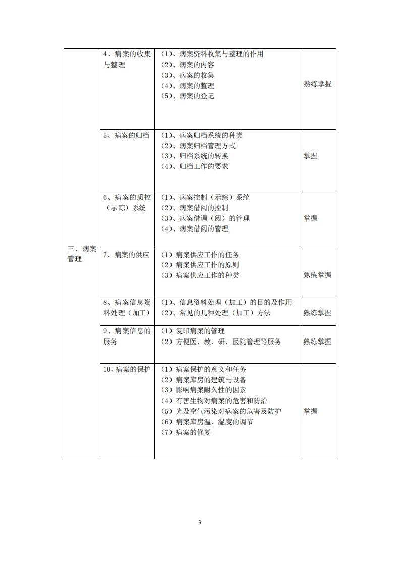 病案信息技术-(中级)基础知识单元细目知识点要求1.前言(1)病案的定义(2)病案质量的三个标准(合格1良好优秀)(3)病案管理的定义熟练掌握(4)病案管理学的定义2.病案信息的(1)备忘作用熟练掌握作用(2)备考作用熟练掌握(3)守信作用熟练掌握(4)证据作用熟练掌握3.病案管理的(1)中国病案与病案管理发展史发展历史回顾(2)国外病案发展回顾掌握4.病案管理教(1)中国病案管理教育发展史育(2)国外病案管理教育发展史掌握5.病案管理工(1)收集熟练掌握作的基本范畴(2)整理熟练掌握(3)加工熟练掌握一、概论(4)存储熟练掌握(5)质控掌握(6)服务掌握6.各类人员对(1)医院管理人员病案的职责(2)医师(3)护士(4)医技人员(5)病案管理人员熟练掌握(6)医学统计人员(7)计算机专业人员(8)患者7.病案管理的(1)医院经营管理发展趋势(2)医疗纠纷和法律案件(3)卫生信息管理掌握(4)电子病历(5)专业人才的需求8.病案管理学(1)中国医院协会病案管理专业委员会术组织(2)国际病案组织联合会(IFHRO)掌握