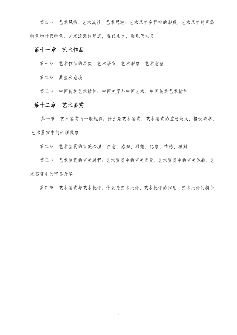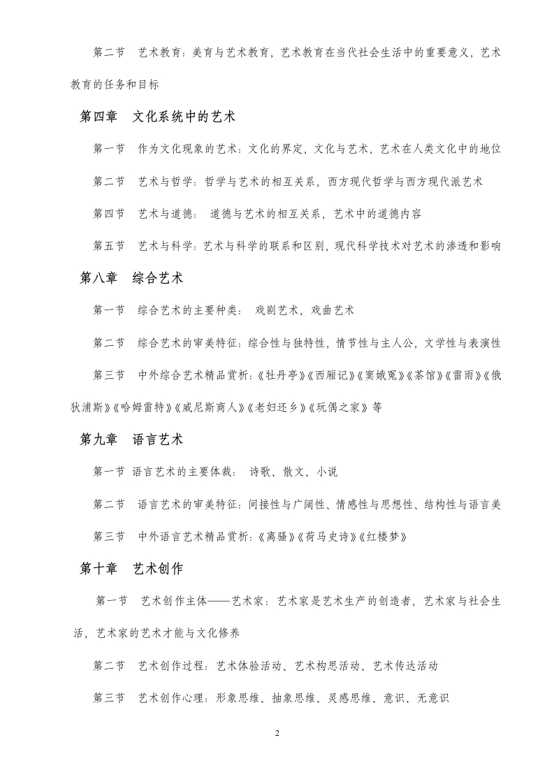 温州大學硕士研究生招生考试(初试)业务课考试大纲考试科目:艺术学基础(自命题)科目代码:624一、参考书目(所列参考书目仅供参考,非考试科目指定用书)彭吉象著:《艺术学概论》(第6版),北京:北京大学出版社,2024年.二、考试形式试卷满分:150分考试时间:180分钟考试题型:填空、名词解释、简答、论述等答题方式:闭卷、笔试三、考查范围第一章艺术的本质与特征第一节艺术的本质:客观精神说,主观精神说,模仿说,再现说,艺术本质问题的科学理论基础等第二节艺术的特征:形象性,主体性,审美性等第二章艺术的起源第一节中外艺术史上关于艺术起源的五种观点:模仿说、游戏说、表现说、巫术说、劳动说第二节艺术起源的第六种看法:多元决定论第三章艺术的功能与艺术教育第一节艺术的社会功能:审美认知作用、审美教育作用、审美娱乐作用