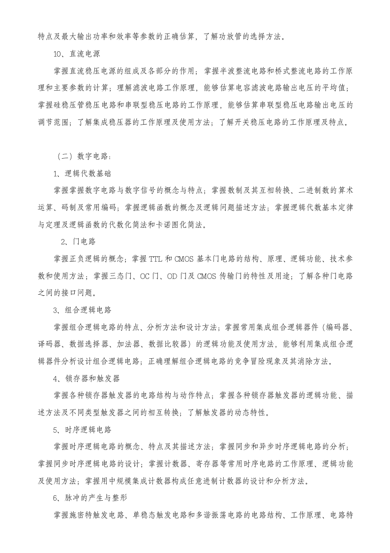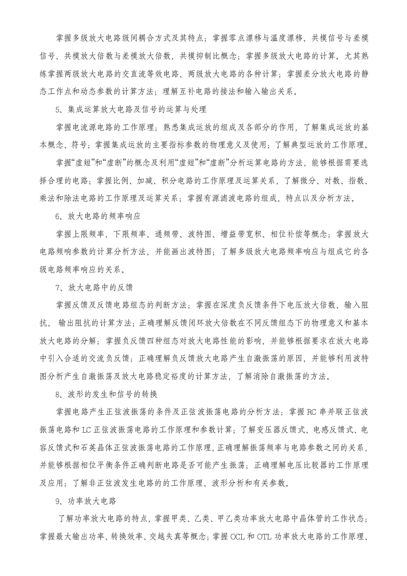 温州大學硕士研究生招生考试(初试)业务课考试大纲考试科目:电子技术基础科目代码:824一、参考书目(所列参考书目仅供参考,非考试科目指定用书):1、模拟电子技术《模拟电子技术基础》(第3版),胡宴如、耿苏燕、周正主编,高等教育出版社,2019年2、数字电子技术:《数字电子技术基础》(第6版),阎石主编,高等教育出版社,2016年二、考试形式试卷满分:150分考试时间:180分钟答题方式:闭卷、笔试三、考查范围:(一)模拟电路:1、电子系统与信号了解电子系统与信号基本知识,放大电路模型及主要指标。2、常用半导体器件掌握自由电子与空穴、扩散与漂移、复合、空间电荷区、PN结、耗尽层,导电沟道等基本概念;掌握PN结的形成与基本特性、二极管V-I特性和特殊二极管的工作机理;掌握晶体管与场效应管的信号放大作用的基本原理;掌握半导体二极管、晶体管、场效应管的外特性、主要参数的物理意义。3、基本放大电路掌握放大电路的基本参数及静态工作点、直流通路与交流通路、直流负载线与交流负载线,饱和失真和截止失真等基本概念。掌握组成放大电路的原则和各种基本放大电路的工作原理及特点,能够根据具体要求选择电路类型;掌握放大电路的分析方法,能够正确估算晶体管和场效应管基本放大电路的静态工作点及应用图解法分析失真情况和h参数等效电路计算电路的放大倍数、输入阻抗、输出阻抗等基本指标,了解稳定静态工作点方法。4、多级放大电路