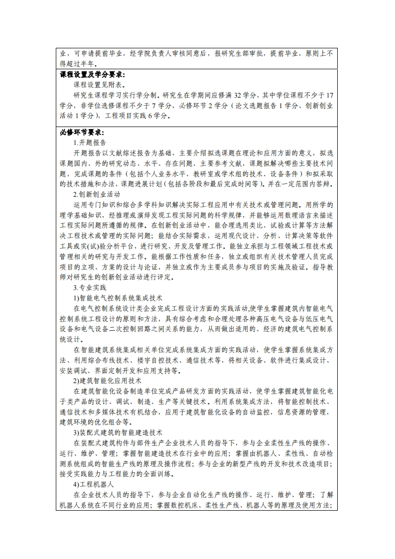 土木水利专业学位研究生培养方案专业名称土木水利(智能建造技术方向)专业代码085900学位类型专业型培养院系控制与机械工程学院专业简介:土木水利领域涉及我校工业与民用建筑物的设计,我校土木水利领域综合实力较强,在国内知名、国外有一定影响,该领域基础坚实,实力雄厚,特色鲜明,具有多年丰富的工程硕士培养经验,为企业和单位培养了一大批创新能力强、高素质的应用型、复合型的高层次工程技术和管理人才,以智能建造技术为主研究方向,结合学院特点延伸出四个子方向,智能电气控制系统集成技术是以电能、电气设备和电气技术为手段来创造、维持与改善限定空间和环境,并在该环境中应用智能化与电气控制技术的综合技术,建筑智能化应用技术以建筑设备智能化为核心,以现代控制技术为依托,对建筑物的所有电气设备进行控制,实现建筑物的综合智能化、信息化,面向装配式建筑的智能建造技术主要围绕工厂化构件与部件的智能生产装备系统开展融合了先进制造技术、大数据、人工智能、物联网等的智能制造模式、设计与工艺技术和性能分析研究,实现装配式建筑工厂化构件与部件的智能建造,工程机器人主要围绕以工程机器人为代表的智能工程机械装备开展结构基础理论与设计方法及制造技术、智能机械装备的运行状态监测的研究,实现智能诊断、预测和控制;并采用先进的加工修复与再制造工艺实现零部件的性能修复与升级,工程施工装备养护维护技术根据工程施工机械装备的使用特点,针对工程施工机械装备保养和维护中存在的问题,系统研究各类工程施工机械装备的运行维护理论与工艺实现技术培养目标:以立德树人为根本,以培养德、智、体、美、劳全面发展的社会主义建设者和接班人为目标。培养拥护中国共产党领导,热爱祖国,遵纪守法,具有服务国家和人民的高度社会责任感、良好的学术道德和职业素养、科学严谨的学习态度、求真务实的工作作风,掌握自然科学的基础理论和土木水利领域的专业知识,具有理论与实践创新能力的复合型高层次人才,智能电气控制系统集成技术突出建筑行业特色,以职业需求为导向,以实践能力培养为重点,以产学结合为途径,培养具有人文素养和国际视野,掌握现代建筑电气与智能化相关理论知识和控制技术、具备执业注册知识和能力、富有创新精神、能够胜任专业技术或管理工作、具有良好职业素养的高层次应用型专门人才,建筑智能化应用技术要求学生掌握建筑智能化相关的基本理论和专门知识,具有分析和解决建筑智能化建设中出现的检测、控制等各方面实际问题的能力,适应建筑智能化建设的技术、管理等职业岗位要求的高素质技能型专门人才,装配式建筑的智能建造技术要求学生掌握融合了以人工智能、大数据和先进制造技术等的相关领域坚实的基础知识和系统的专门知识,具备对装配式建筑领域涉及的智能生产装备、工艺技术开展性能分析与设计研究及系统集成应用的能力,面向装配式建筑行业及相关工程部门培养基础扎实、素质全面、工程实践能力强、具有团队协作精神和良好的组