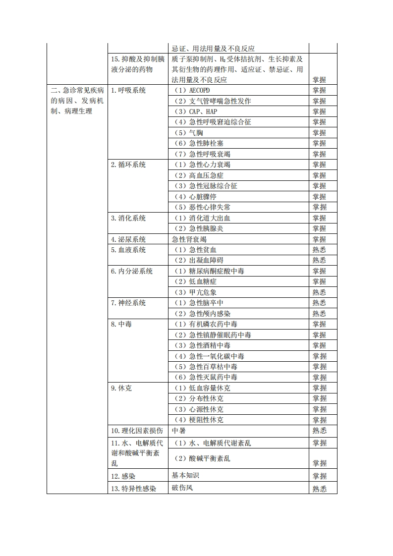 急诊医学考试大纲基础知识单元细目要点要求、急诊药理学1.镇痛镇静药吗啡、芬太尼及衍生物、氟比洛芬酯、丙泊酚、苯二氮草类药物的药理作用、适应证、禁忌证及用法用量掌握2.血管活性药物肾上腺素、去甲肾上腺素、多巴胺及异丙基肾上腺素的药理作用、适应证及用法用量掌握3.高血压急症用硝普钠、硝酸甘油、尼卡地平及乌拉地尔的药药理作用、适应证、禁忌证、用法用量、不良反应及注意事项掌握4.抗恶性心律失利多卡因、艾司洛尔、胺碘酮及地尔硫草的常药物药理作用、适应证、禁忌证、用法用量、不良反应及注意事项掌握5.急诊溶栓药尿激酶、阿替普酶的药理作用、适应证、禁忌证、用法用量及不良反应掌握6.急诊抗栓药(1)阿司匹林、氯吡格雷的药理作用、适应证、禁忌证、用法用量及不良反应掌握(2)肝素、低分子肝素、磺达肝癸钠、华法林的药理作用、适应证、禁忌证、用法用量及不良反应掌握7.急诊抗心肌缺硝酸酯类药物的药理作用、适应证、禁忌证、血药用法用量及不良反应掌握8.正性肌力药物去乙酰毛花苷、多巴酚丁胺、米力农、左西孟旦的药理作用、适应证、用法用量、不良反应及注意事项掌握9.急诊常用抗微青霉素类、头孢菌素类、碳青霉烯类、喹诺生物药物酮类、氨基糖苷类、大环内酯类、糖肽类及奥司他韦的药理作用、临床应用及不良反应掌握10.急诊常用解毒(1)有机磷中毒解毒药:氯解磷定、碘解磷药物定的药理作用、临床应用及不良反应:抗胆碱能药物阿托品、长托宁的药理作用、临床应用及注意事项掌握(2)中枢神经抑制剂解毒药:氟马西尼、纳洛酮的临床应用及注意事项掌握11.脱水、利尿剂甘露醇、甘油果糖及速尿的药理作用、适应证、用法用量及不良反应掌握12.止血药凝血酶、酚磺乙胺、氨甲苯酸的药理作用、适应证、禁忌证、用法用量及不良反应掌握13.胃肠解痉药阿托品、山莨菪碱的药理作用、适应证、禁忌证、用法用量及不良反应掌握14.平喘药茶碱类、沙丁胺醇的药理作用、适应证、禁掌握