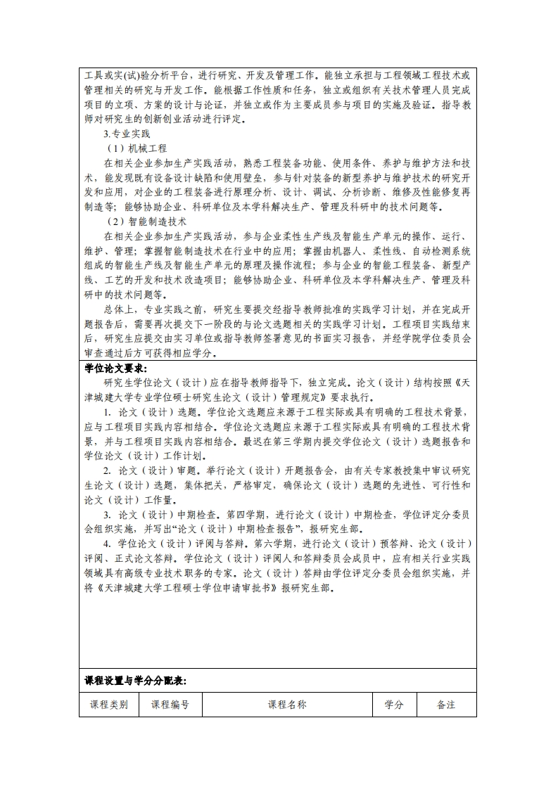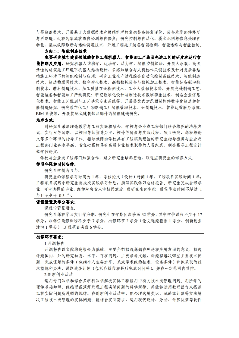 机械专业学位研究生培养方案专业名称机械专业代码0855学位类型专业型培养院系控制与机械工程学院专业简介:机械类别归属我校智慧城市学科群和城市建设学科群,为学校重点发展领域,是以城市建设装备为主线,研究现代设计方法、智能制造技术、诊断维护技术以及智能控制技术,该领域拥有厚实的科研基础、充足的人才储备和教学资源,特色鲜明,具有一定的专业硕士培养经验,将为企事业单位培养一批创新能力强、高素质的应用型、复合型的机械领域工程技术和管理人才,我校的机械类别包含机械工程和智能制造技术两个领域方向,以计算机科学、材料学、力学、制造工艺学和控制论为理论基础,将人工智能与制造业和建造业相结合,研究智能制造与智能建造技术、城市建设装备智能诊断与智能养护修护再制造技术、智能工程机器人技术、城市建设装备与产线优化设计与动力修改、城市建设装备的智能检测与智能控制技术、建筑施工环境下的机器人系统控制、多感知融合与人机协作关键技术等,研究的成果服务于工程实际,为企事业单位提供相关工程方面的人才,培养目标:以立德树人为根本任务,践行社会主义核心价值观,以培养具有家国情怀,德、智、体、美、劳全面发展的社会主义事业可靠接班人和合格建设者为目标,机械专业硕士培养突出城市建设行业特色,以职业需求为导向,以实践能力培养为重点,以产学结合为途径,具有理论与实践创新能力的复合型高层次人才,培养的专业型硕士研究生应达到以下目标:(1)培养拥护中国共产党领导,热爱祖国,遵纪守法,具有服务国家和人民的高度社会责任感、良好的学术道德、科学严谨的学习态度、求真务实的工作作风:(2)具有人文素养和国际视野、良好的知识产权意识、良好职业素养、一定学术创新能力和较强的学术交流能力、团队协作精神和良好的组织协调能力;(3)能综合运用机械、人工智能、控制等相关领域坚实的基础知识、系统的专业知识和专业技术,解决本领域涉及的技术与工程应用问题,开展具有较高工程应用意义的工程技术工作;具有良好的实践研究和技术创新能力,能独立承担与机械领域工程技术或管理相关的研究与开发工作,能适应机械领域的发展需求。(4)研究生毕业后可在机械领域的科研院所和企业中作为技术骨干从事科学研究、技术开发和管理等工作,研究方向:方向一:机械工程主要研究城市建设领城的复杂装备系统、智能诊断与预测、智能养护修护再制造、(高大难深工程)装备的智能检测与智能控制。研究绿色全生命周期设计方法、创新设计技法等,开展复杂装备系统的绿色创新设计;研究复杂结构实验建模理论和方法、动力学分析方法、多物理场耦合问题及协同仿真技术、模态参数辨识方法、动态优化设计和动力修改策略,开展整机和关键零部件的性能及可靠性提升优化设计和评价;研究故障诊断与预测技术,开展高大难深工程施工装备在复杂工况下的故障信号在线智能检测策略、故障特征提取与智能辨识、故障预测预报、装备远程安全健康监测和智能诊断;研究智能养护维护