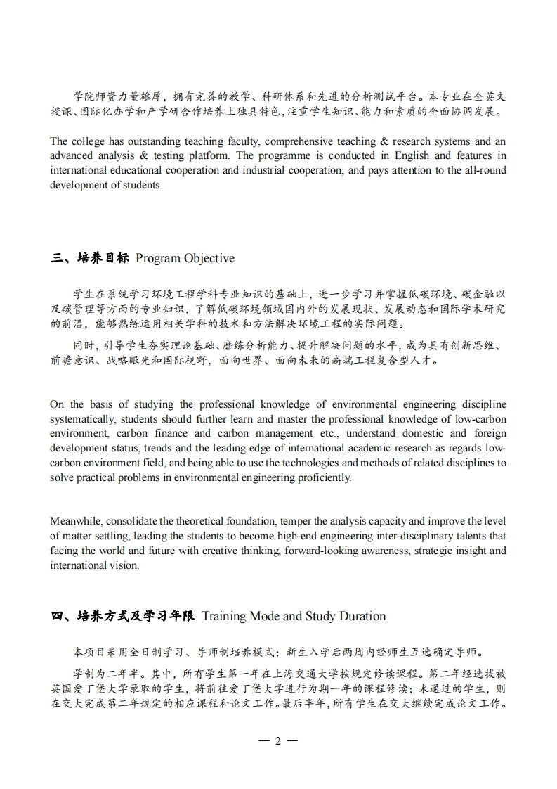 (085700)环境科学与工程学科2020级全日制硕士研究生培养方案2020 Full-time Master Program for Environmental Science and Engineering一、基本信息Basic Information院系名称中英国际低碳学院适用年级2020级ClassSchoolChina-UK Low Carbon CollegeGrade造用专业资源与环境(低碳环境方向)标准学制MajorResource and Environment (Low CarbonDuration2.5年YearsEnvironment)学习形式Study Mode全日制Full time项目类型专业型ProfessionalProgram Type培养层次硕士生Master StudentProgram Level最低学分30最低GPA学分19最低GPA2.7Min CreditMin GPA CreditMin GPA二、专业领域简介Introduction全球气候变化深刻影响着人类的生存和发展,是各国共同面临的重大挑战。资源与环境(低碳环境方向)专业旨在通过技术、行政、市场等手段,加快推进绿色低碳发展进程,解决温室气体及相关污染物排放过量等问题,增强人类应对气候变化的能力。本专业与化学、生物学以及社会学等多学科相交叉,以相关环境问题为研究对象,利用有关基础学科的原理、方法和工程技术实施具体的规划、管理和工程措施,实现自然资源合理利用、清洁生产、废物资源化与能源化、污染防治、环境保护和质量改善,为社会、经济和环境的可持续发展提供支撑。Global climate change has a profound impact on human survival and development,and is a majorchallenge for all countries.The resources and environment programme (low carbon environmentdirection)aims to speed up the process of green and low carbon development,solve the problem ofexcessive emission of greenhouse gases and related pollutants,and enhance human's ability to copewith climate change by means of technology,administration,market and other means.This major isinterdisciplinary with chemistry,biology,sociology and other disciplines,taking relevantenvironmental issues as research objects,and using the principles,methods and engineeringtechnologies of relevant basic disciplines to implement specific planning,management andengineering measures,so as to realize the rational use of natural resources,clean production,wasteresource and energy,pollution prevention and control,environmental protection and qualityimprovement,provide support for the sustainable development of society,economy and environment.1