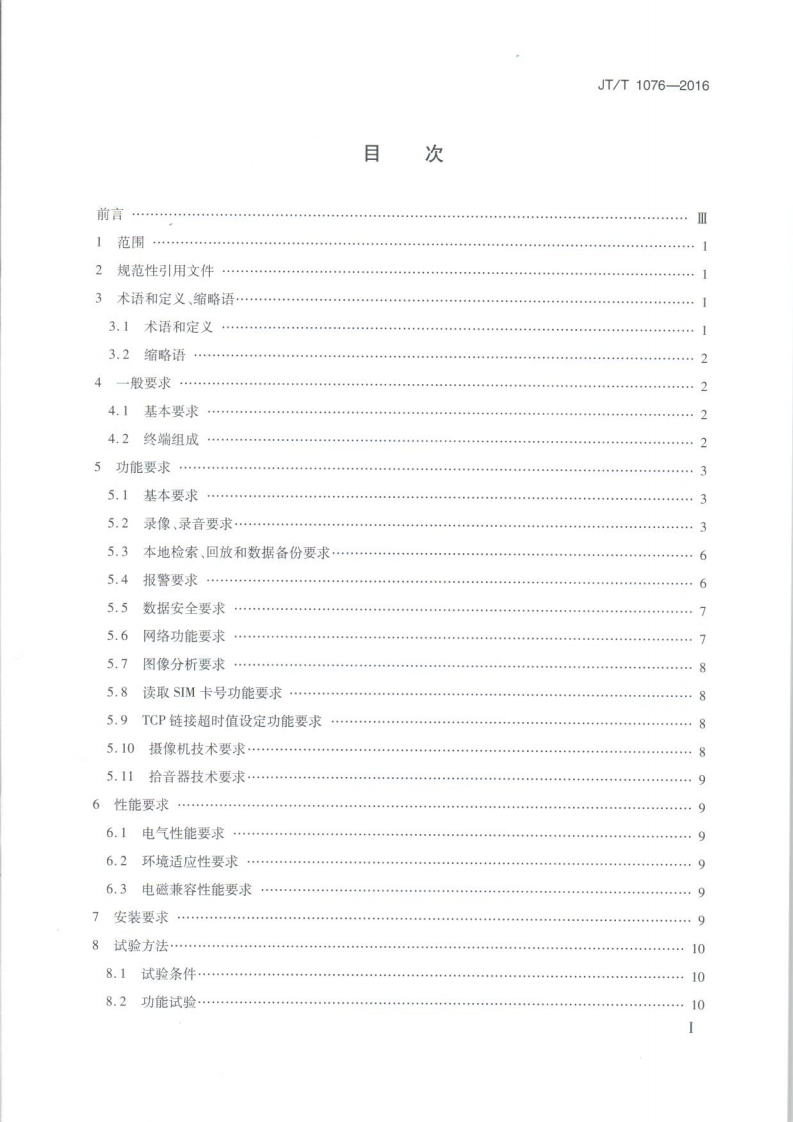 1CS03.220.20:33.160.99M32号:cT222切备案号:受控文件鼎2a72.20中华人民共和国交通运输行业标准JT/T1076-2016道路运输车辆卫星定位系统车载视频终端技术要求GNSS system for operating vehicles-Technical specifications for vehicle video terminal2016-10-21发布2017-01-01实施中华人民共和国交通运输部发布