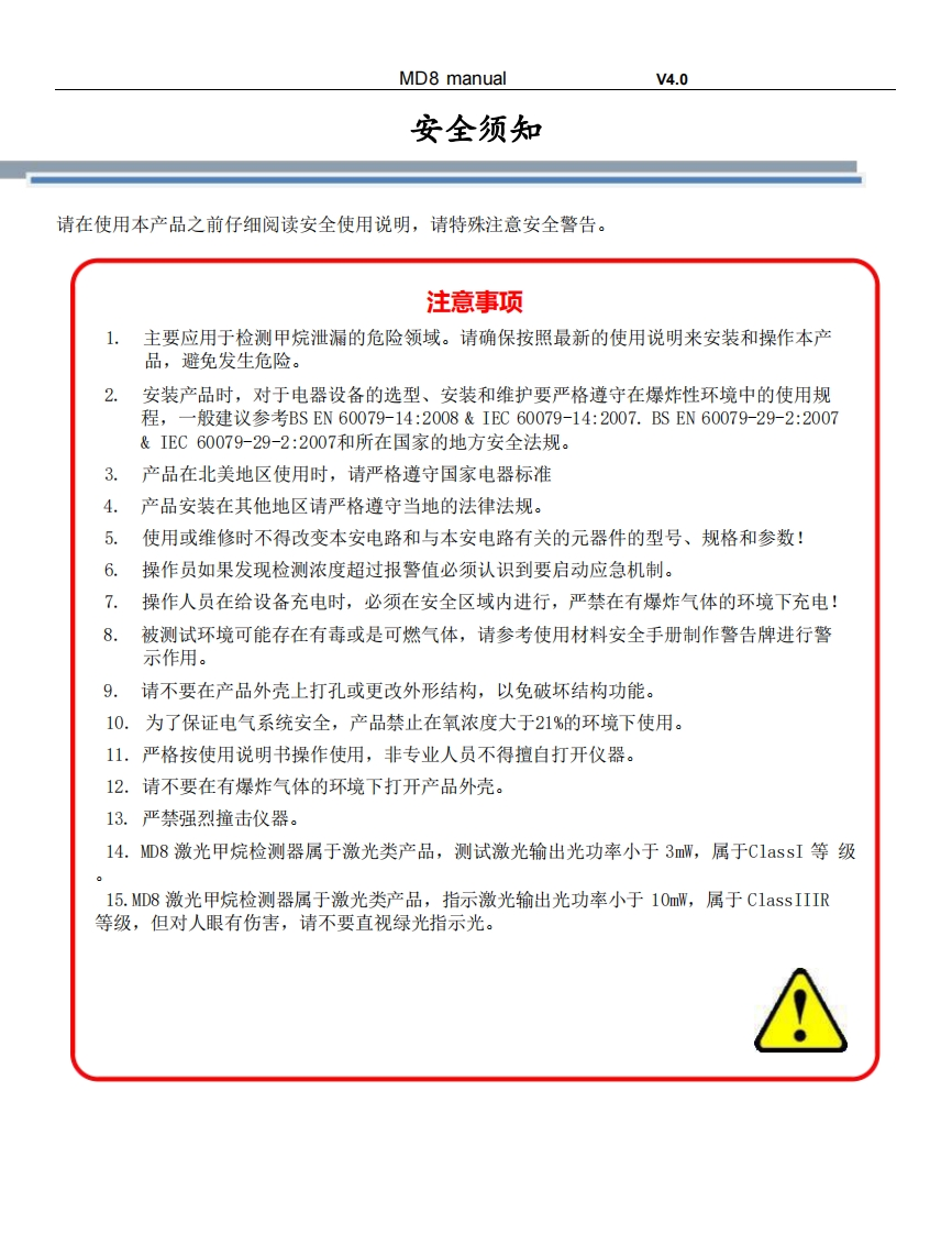 手持激光甲烷遥测仪MD8-操作说明书348072@abc4天前发布关注私信1.18MB28页035手持激光甲烷遥测仪MD8-操作说明书此内容为付费资源,请付费后查看¥19¥29黄金会员免费钻石会员免费立即购买您当前未登录!建议登陆后购买,可保存购买订单付费资源 第1页 / 共28页 第2页 / 共28页 第3页 / 共28页 试读已结束,还剩25页,您可下载完整版后进行离线阅读 THE END仪器仪表 文本预览 MD8 manualV4.0技术手册激光甲烷气体遥测仪感谢您选购本产品!为了保证安全并获得最佳效能,使用产品前,请详细阅读本使用说明书并妥善保管,以备今后参考。执行标准:GB3836-2010Q/FGC1001-2020版本号:4.0西安捷通智创仪器设备有限公司出版日期:2025年11月 查看更多 收起部分 喜欢就支持一下吧收藏