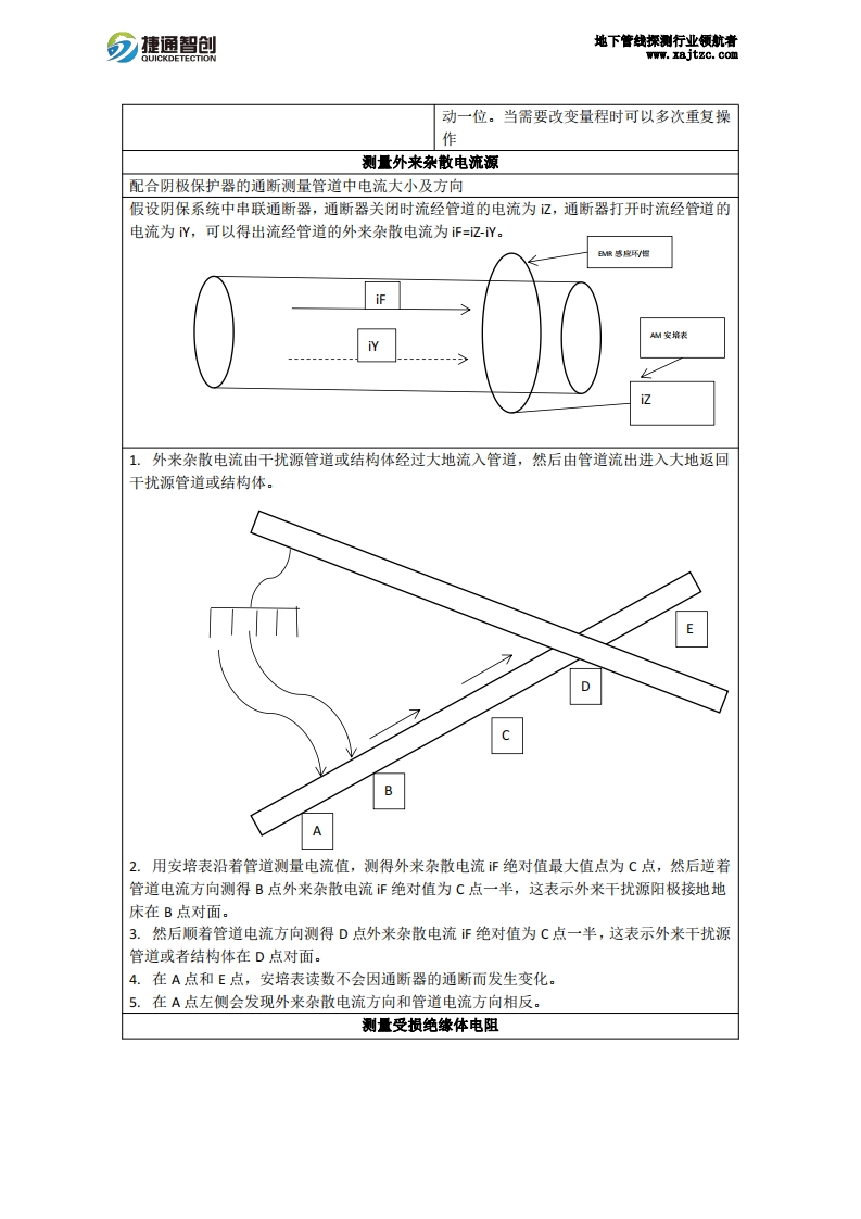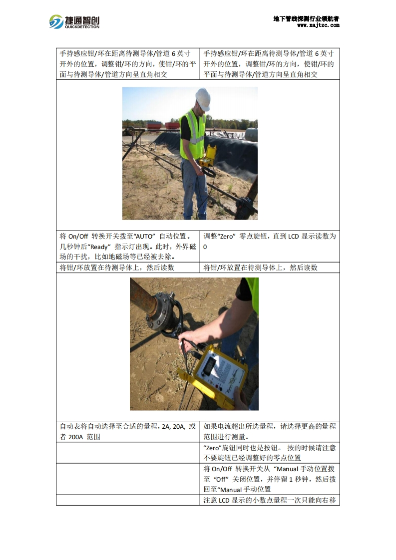 分捷通智创地下管钱探测行业领航者www.xajtzc.com杂散电流感应器MER2-AM斯万钳环式电流检测仪尺寸电流钳3/4英寸至7英寸(19mm-178m)电流环8英寸至100英寸(203mm-2540mm)以及AM13/AM49/50系列电流表构成AM系列的安培表和配套MER2感应环/钳,没有发射机测量量程0~200A(0-2A|0-20A0-200A)防止300A过载提供可选外部电源(C-Cel1碱性电池)可工作50小时分辨率在0-2安培量程范围,分辨率为1mA在0-20安培量程范围,分辨率为10mA在0-200安培量程范围,分辨率为100mA工作方式无需接触被测管道抗干扰斯万安培表能过滤掉10安培以内的交流干扰,以保证直流电流测量的准确性。但是AC交流干扰会引起腐蚀,所以当交流电流超过10A时会影响直流电流测量的精度工作环境水下/地面(必须有外接电源阴极保护装置),还可以安装在水下/地下长期检测阴保状态主要作用1.用于检测管道阴极保护效果2.用于管道腐蚀检测3.用于检测管道,接地导体,阳极杂散直流电4.识别管道中受损的绝缘子5.检测管道中电流泄露检测电流特性检测直流电测量方式自动/手动检测仪显示电流大小及方向检测仪工作方式现场读数/可选数据记录仪,无线远传系统协同办公注意事项1.MER2表的外部己经做好了电绝缘,干燥情况下的电压值为25V,请不要在未做好自身绝缘防护的情况下徒手测量高电压的导体。在待测导体有高压危险的情况下,测量过程中双手尽量远离MER表。2.本产品采用电池供电,为便携式的测量装置。一旦将其插入120V/220V交流电源中会破坏本产品且导致附近的人员伤害。使用过程中请穿戴好PPE防护。仪器图片斯万钳环式电流检测仪工作方法自动模式手动模式自动模式下,25-30分钟后自动关机手动模式下,长期开机将感应钳/环连接到斯万自动表上将On/o仟转换开关拨至“Manual手动位置