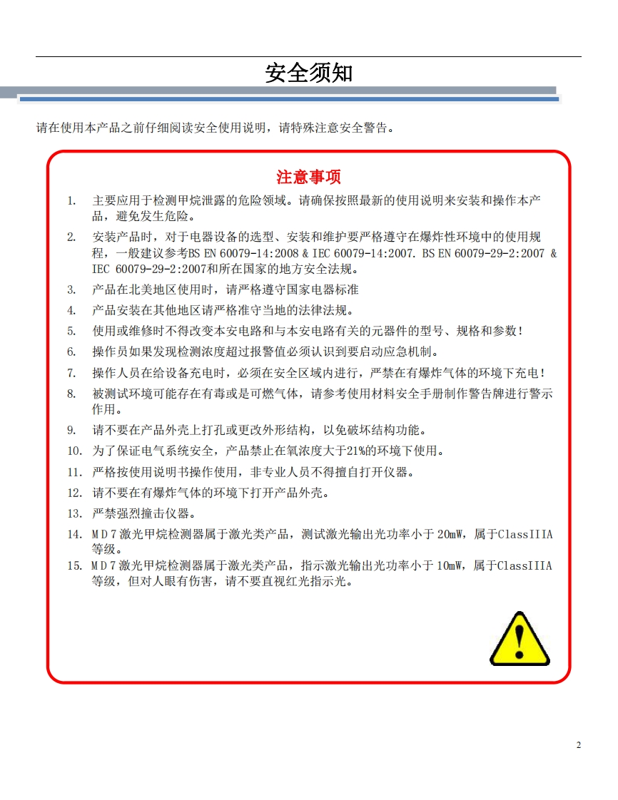 激光甲烷遥测仪MD7–使用说明书348072@abc3天前发布关注私信3.49MB23页034激光甲烷遥测仪MD7–使用说明书此内容为付费资源,请付费后查看¥19¥29黄金会员免费钻石会员免费立即购买您当前未登录!建议登陆后购买,可保存购买订单付费资源 第1页 / 共23页 第2页 / 共23页 第3页 / 共23页 试读已结束,还剩20页,您可下载完整版后进行离线阅读 THE END仪器仪表 文本预览 捷通智创QUICKDETECTION激光甲烷遥测仪MD7产品使用说明书感谢您选购本产品!为了保证安全并获得最佳效能,使用产品前,请详细阅读本使用说明书并妥善保管,以备今后参考。执行标准:GB3836-2010Q/FGC1001-2020版本号:1.0 查看更多 收起部分 喜欢就支持一下吧收藏