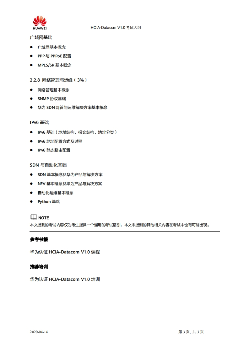 HUAWEIHCA-Datacom V1.0考试大纲HCIA-Datacom V1.0考试大纲华为认证HCIA-Datacom认证考试认证名称考试代码考试名称语言考试费用考试时长通过分数/总分HCIA-H12-811HCIA-Datacom V1.0CHS/ENU200USD90min600/1000Datacom考试内容HCIA-Datacom V1.0考试覆盖数通础知识,包括TCP/IP协议栈基础知识,OSPF路由协议基本原理以及在华为路由器中的配置实现,以太网技术、生成树、VLAN原理、堆叠技术以及在华为交换机中的配置实现,网络安全技术以及在华为路由交换设备中的配置实现,WLAN相关技术与基本原理以及在华为无线设备中的配置实现,SNMP等网络管理的基本原理,PPP等广域网协议基本原理以及在华为路由器中的配置实现,IPv6的基础知识以及ICMPve6、DHCPv(6协议基本原理和配置实现,SDN基本原理以及华为相应产品与解决方案的实现,编程自动化基本原理。知识点占比章节此数据通信与网络基础8%构建互联互通的P网络27%构建以太交换网络28%网络安全基础与网络接入8%网络服务与应用5%WLAN基础109%广域网基础3%网络管理与运维3%IPv6基础5%SDN与自动化基础3%知识点数据通信与网络基础·数通基础知识·网络基本概念、P网络构架、标准化组织与协议2020-04-14第1页,共3页