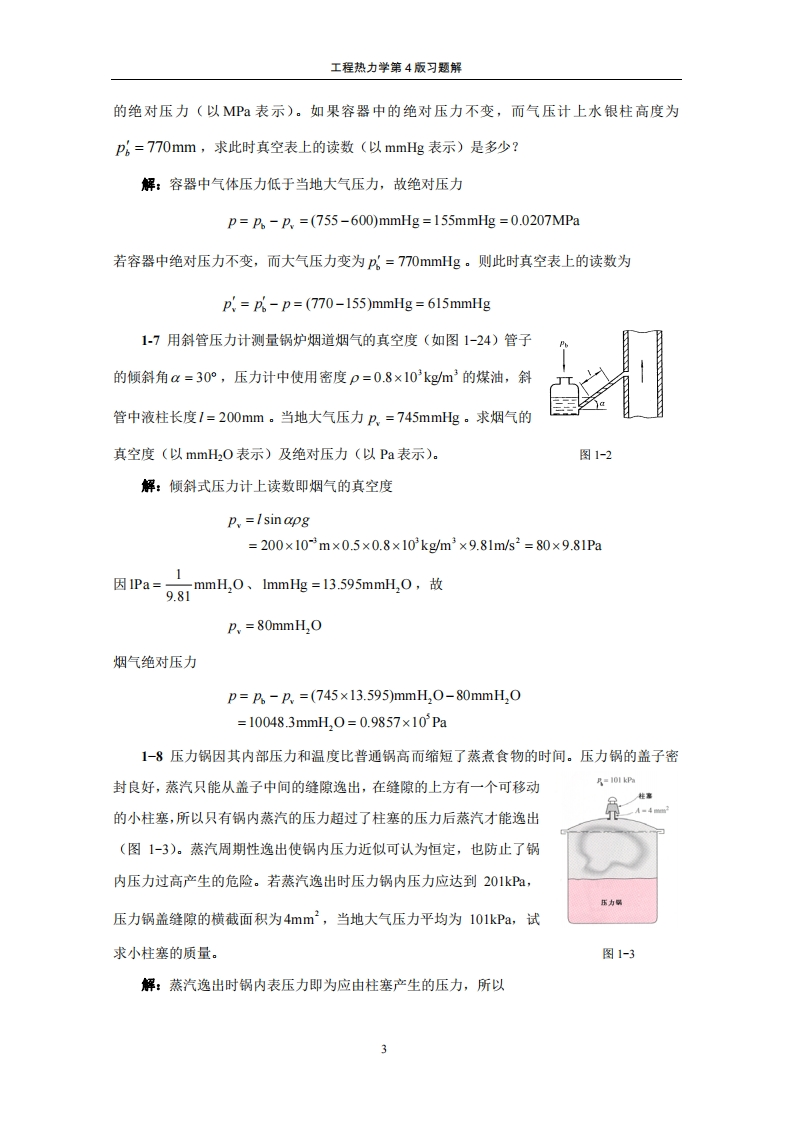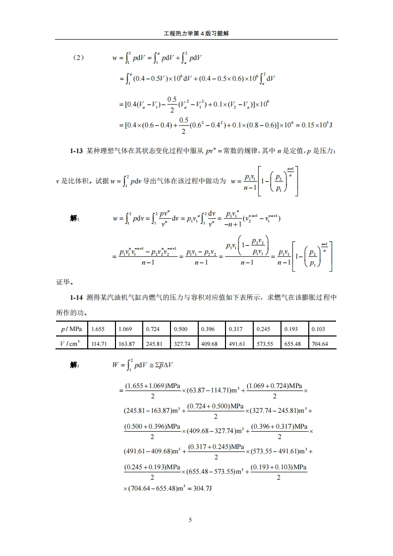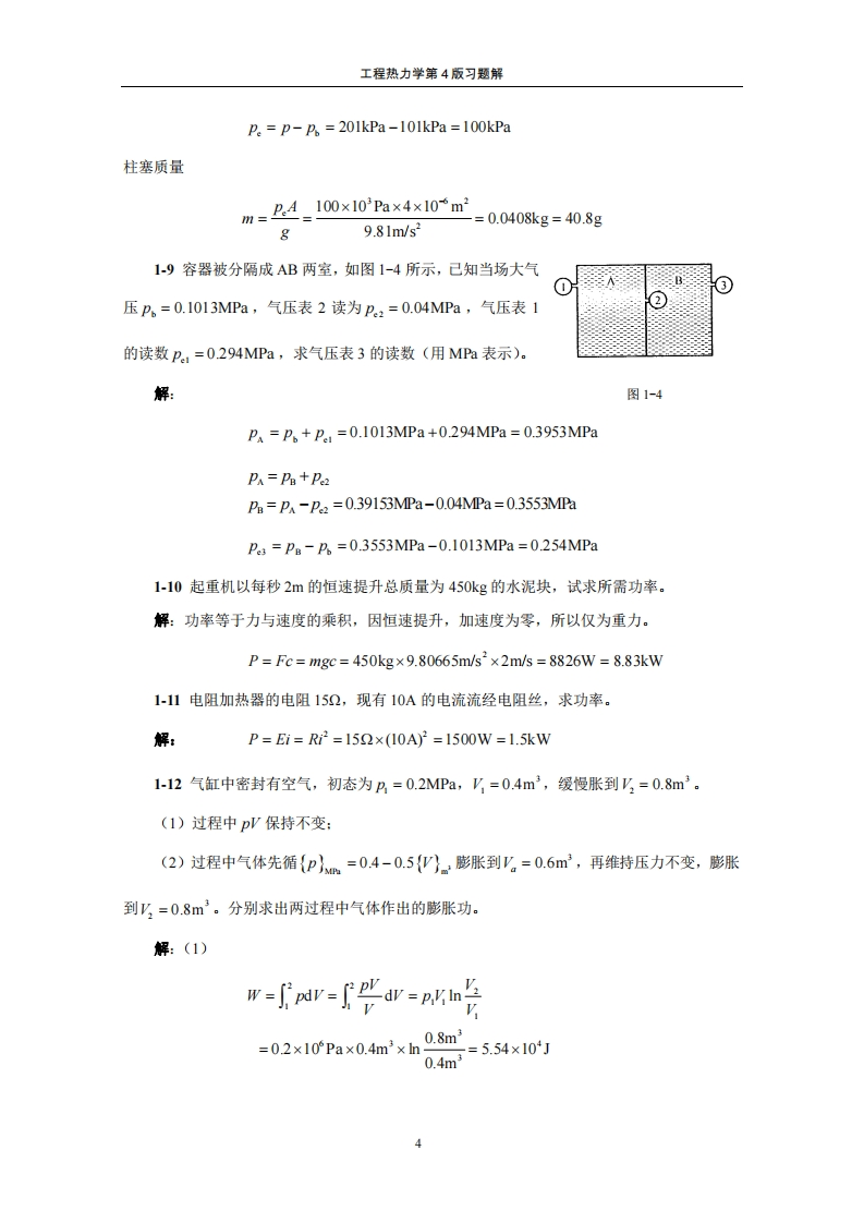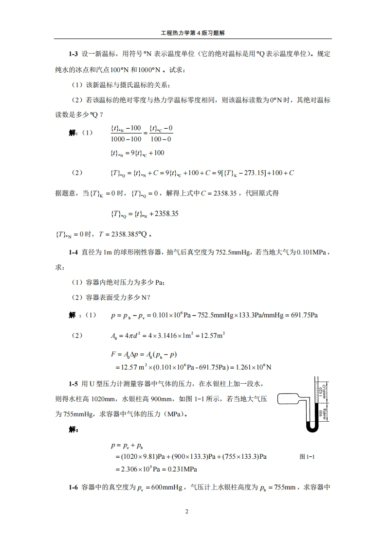 工程热力学第4版习题解工程热力学第4版习题解本题解是沈维道、童钧耕编写高等教育出版杜出版的“十一五”国家级规划教材《工程热力学》第4版的配套资料。本题解提供的解法是从教学的角度出发的,未必是唯一的或是最好的,题解中出现的错误恳请读者批评指正。上海交通大学机械与动力工程学院童钧耕2007/11/22第一章基本概念1-1英制系统中采用华氏温标,它规定在标准大气压(101325Pa)下纯水的冰点是32℉,汽点是212℉,试推导华氏温度与摄氏温度的换算关系。解:{te-32_{t}c-0212-32100-0{t}e=e+32=2e+321801001-2英制系统中朗肯温度与华氏温度的关系为TR={+459.67。己知热力学绝对温标及朗肯温标在纯水冰点的读数分别是273.15K和491.67°R:汽点的读数分别是373.15K和671.67R.(1)导出朗肯温度和开尔文温度的关系式:(2)开尔文温标上绝对零度在朗肯温标上是多少度?解:(1)若任意温度T在朗肯温标上读数为T(R)在热力学绝对温标上读数为T(K),则671.67-491.67_T(°R)-491.67373.15-273.15T(K)-273.15解得{Tg=1.8{T}x(2)据上述关系{TK=0时,{TR=0