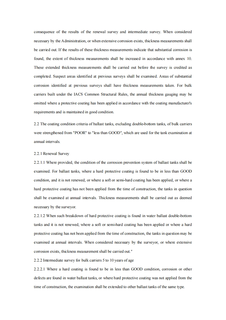 CCSTechnical Information(2023)Technical Information No.17 Total No.6170ct10,2023(Total 4 pages)To:ship owners,shipping management companies,CCS all branches surveyorsTechnical Notice on Resolution MSC.525 (106)"Amendments tothe International Code on the Enhanced Programme ofInspections During Surveys of Bulk Carriers and Oil Tanks2011”issued by IMO1.BackgroundThe Maritime Safety Committee of International Maritime Organization (IMO)adoptedAmendments to International Code on the Enhanced Programme of Inspections during Surveys ofBulk Carriers and Oil Tankers,2011 ("the 2011 ESP Code"),by Resolution MSC.525(106)at its106th session,which will take effect on 1st July 20242.Main revisions2.1 Add the survey requirements for the double-side skin void spaces bounding cargo holds forbulk carriers exceeding 20 years of age and of 150m in length and upwards.2.1.1 Intermediate survey and Renewal survey for the above carriers,where provided,thecondition of the corrosion prevention system of void spaces shall be examined.Where a hardprotective coating is found to be in POOR condition,and it is not renewed,or where a soft orsemi-hard coating has been applied,or where a hard protective coating has not been applied fromthe time of construction,the void spaces in question shall be examined at annual intervals.Thickness measurements shall be carried out as deemed necessary by the surveyor.2.1.2 Annual survey for the above carriers,where provided,shall be carried out when required as a
