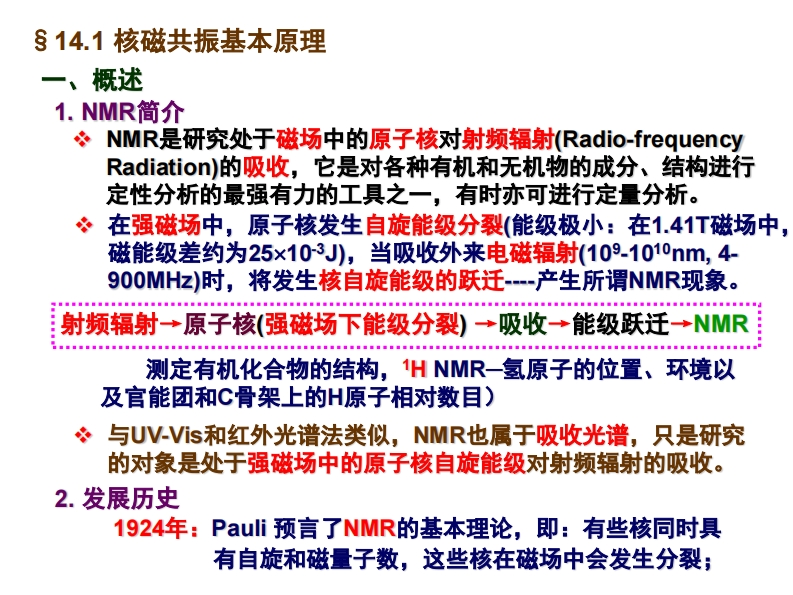 核磁共振波谱法348072@abc4天前发布关注私信23.29MB40页047核磁共振波谱法此内容为付费资源,请付费后查看¥19¥29黄金会员免费钻石会员免费立即购买您当前未登录!建议登陆后购买,可保存购买订单付费资源 第1页 / 共40页 第2页 / 共40页 第3页 / 共40页 第4页 / 共40页 第5页 / 共40页 试读已结束,还剩35页,您可下载完整版后进行离线阅读 THE END人工智能单片机设计机械电气设计物联网设计 文本预览 及门太子仪器分析(下)第十四章核磁共振被谱法Nuclear Magnetic Resonance SpectroscopyNMR 查看更多 收起部分 喜欢就支持一下吧收藏