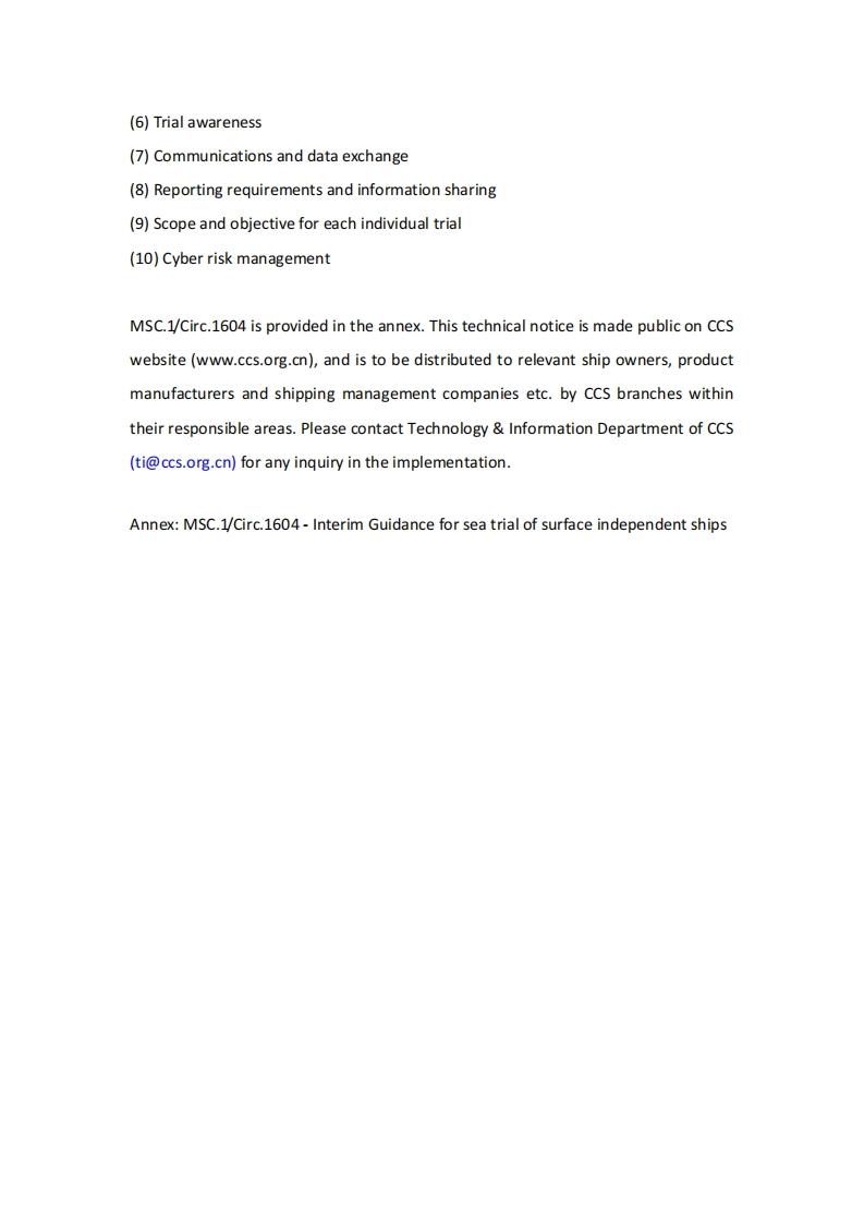 CCSTechnical Information(2020)Technical Information No.18 Total No.452Feb.18,2020(Total 6 pages)To:Relevant shipowners,ship management companies,shipyards and designers,productmanufacturer,related departments of the Headquarters of CCS,the Society's surveyors,Plan Approval CentersTechnical Notice of Interim Guidelines for MASS Trials(MSC.1/Circ.1604)Issued by IMO1.BackgroundAt its 101st session,the Maritime Safety Committee of the International MaritimeOrganization (IMO)approved the interim guideline for MASS trials in the form ofMSC.1/Circ.1604 on June 14,2019.The purpose of this guideline is to improve the safety and efficiency of the technicaltest of the MASS by giving the requirements for the test of the MASS.At the sametime,this guideline has guiding significance for other new technologies and complexsystem sea trial requirements.2.Main contentThis guide is applicable to the MASS trials requirements.It has 10 mainrequirements:(1)Risk managements(2)Compliance with mandatory instruments(3)Manning and qualifications of personnel involved in MASS trials(4)Human element (including monitoring infrastructure and human-systeminterface)(5)Infrastructure for safe conduct of trials
