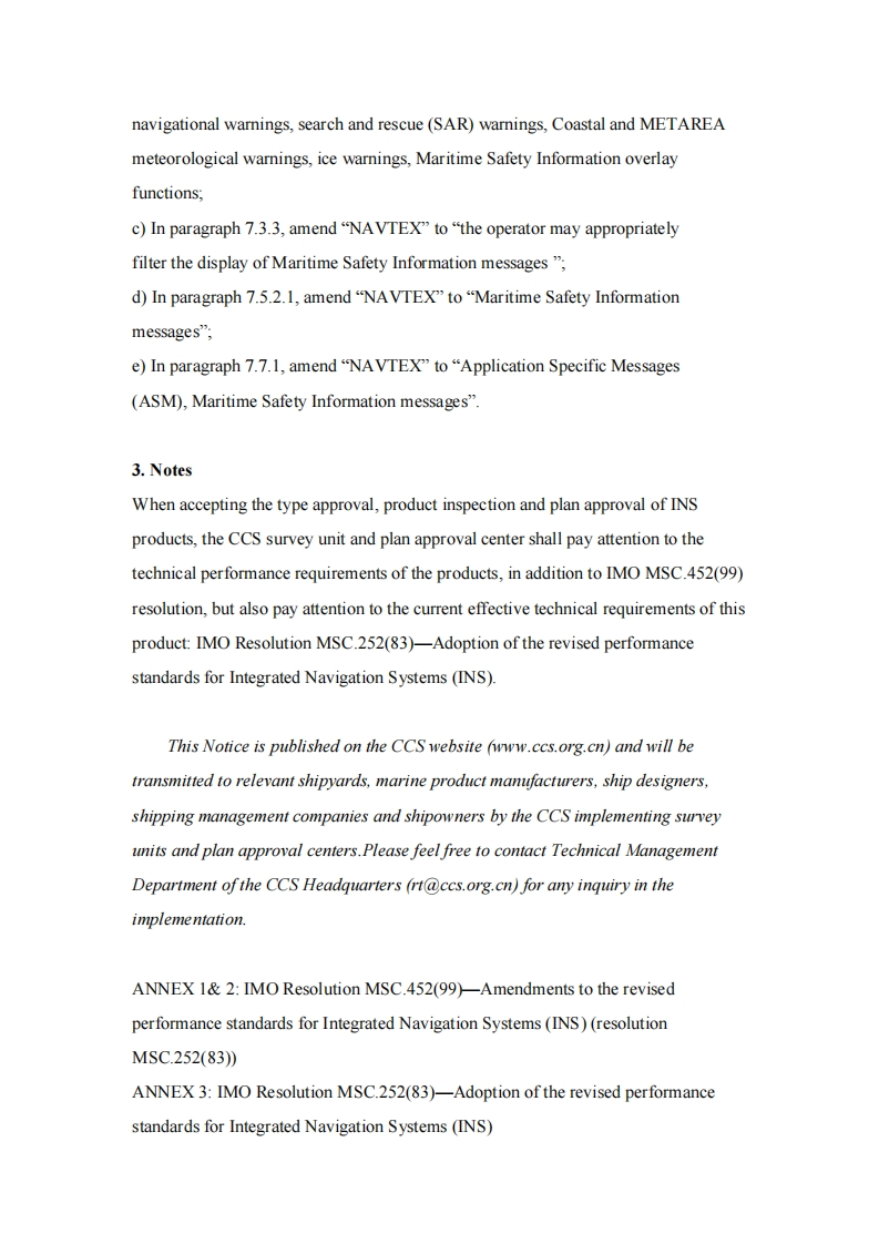 CCSTechnical Information(2020)Technical Information No.65 Total No.499Nov.16,2020(Total 2 pages)To:Related departments of CCS Headquarters,each plan approval center,each branch(office),concerned shipyards,marine product manufacturers,ship designers,shipping managementcompanies and shipownersTechnical Notice of Product Inspection on amendments to revisedperformance standards for Integrated Navigation Systems(INS)(Resolution MSC.452(99))issued by IMO1.BackgroundThe Maritime Safety Committee (MSC)of International Maritime Organization(IMO),at its ninety-ninth session(16 to 25 May 2018),adopted the revisedperformance standards for Integrated Navigation Systems(INS)(resolutionMSC.252(83))by resolution MSC.452(99).INS equipment installed on or after 1 July2020 conforms to performance standards not inferior to those set out in the annex tothe resolution.2.Main contentsThe major modification requirements of this revised performance standards forIntegrated Navigation Systems (INS)(resolution MSC.252(83))areas follows:a)In paragraph 3.5,the following requirement is added at the end of table 2:NAVTEX or other IMO-recognized equipment,Recognized mobile satellite serviceenhanced groupcalling system;b)In paragraph 7.3.2,the following requirement is added:Coastal and NAVAREA