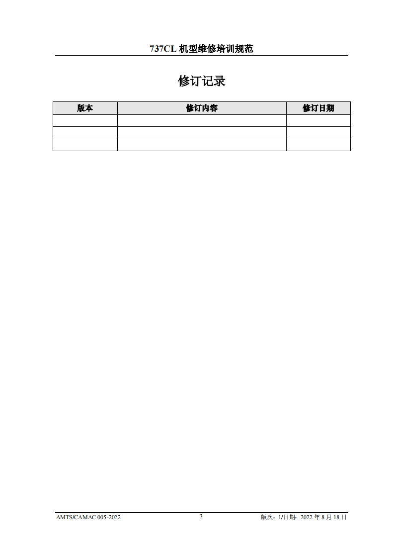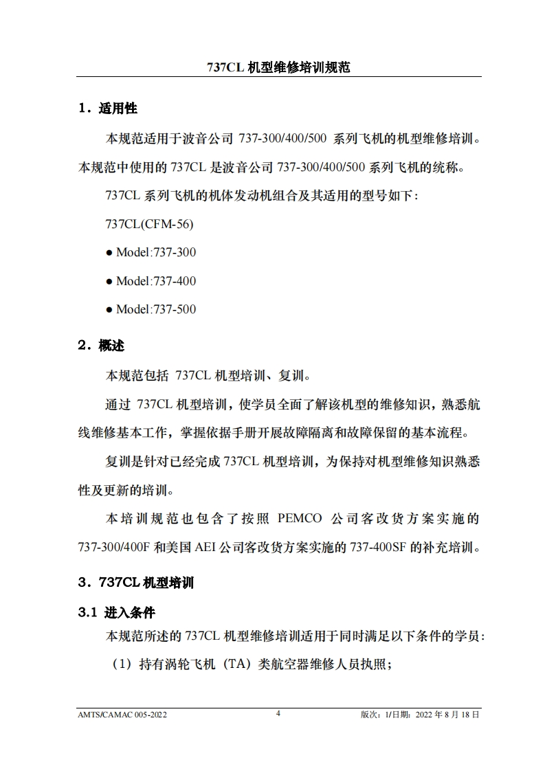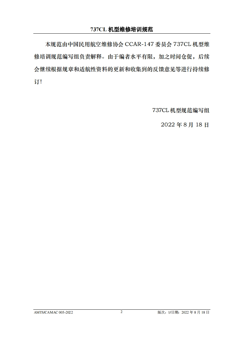 CA4光中国民用航空维修协会737CL机型维修培训规范AMTS/CAMAC 005-2022第1版/2022年8月18日文件由中国民用航空维修协会民航维修培训机构工作委员会(CCAR-147委员会)编制,并经中国民用航空局航空暴评审组(AEG)的认可。航空运营人、维修单位或维修培训机构在开展机型维修培训时可参考本文件制定相应的机型维修培训教学大纲。本文件将根据737CL机型的设计更改和使用反馈进行修订、请上述相关方子以及时关注、以评估对所编制教学大纲的影响。