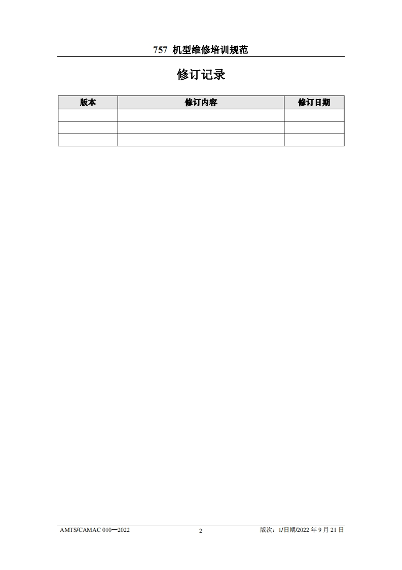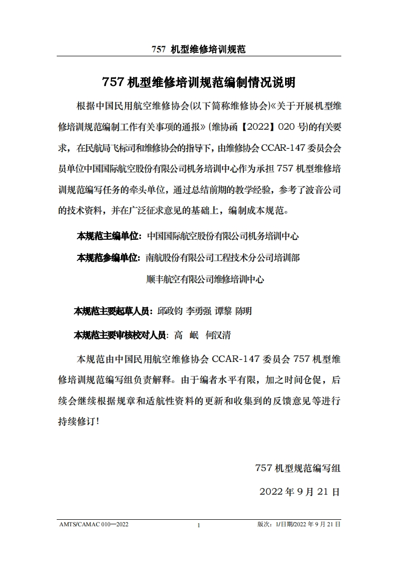 CAH光中国民用航空维修协会757机型维修培训规范AMTS/CAMAC 010-2022第1版/2022年9月21日本文件由中国民用航空维修协会民航维修培训机构工作委员会(CCAR-147委员会)编制,并经中国民用航空局航空器评审组(AEG)的认可。航空运营人、维修单位或维修培训机构在开展机型维修培训时可参考本文件制定相应的机型维修培训教学大纲。本文件将根据757机型的设计更改和使用反馈进行修订,请上述相关方予以及时关注,以评估对所编制教学大纲的影响。