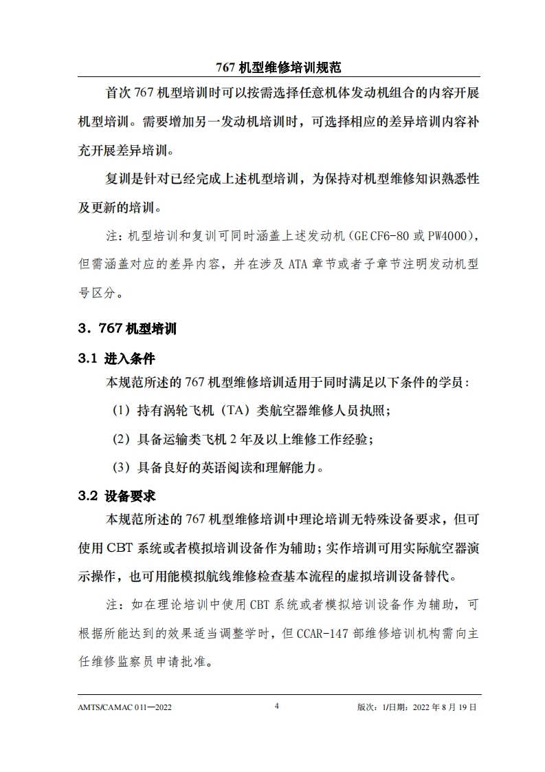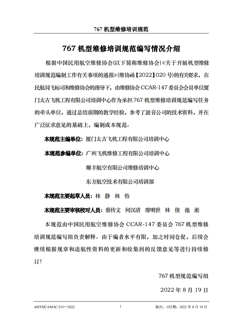 CAH光中国民用航空维修协会767机型维修培训规范AMTS/CAMAC 011-2022第1版/2022年8月19日本文件由中国民用航空维修协会民航维修培训机构工作委员会(CCAR-147委员会)编制,并经中国民用航空局航空器评审组(AEG)的认可。航空运营人、维修单位或维修培训机构在开展机型维修培训时可参考本文件制定相应的机型维修培训教学大纲。本文件将根据767机型的设计更改和使用反馈进行修订,请上述相关方予以及时关注,以评估对所编制教学大纲的影响。