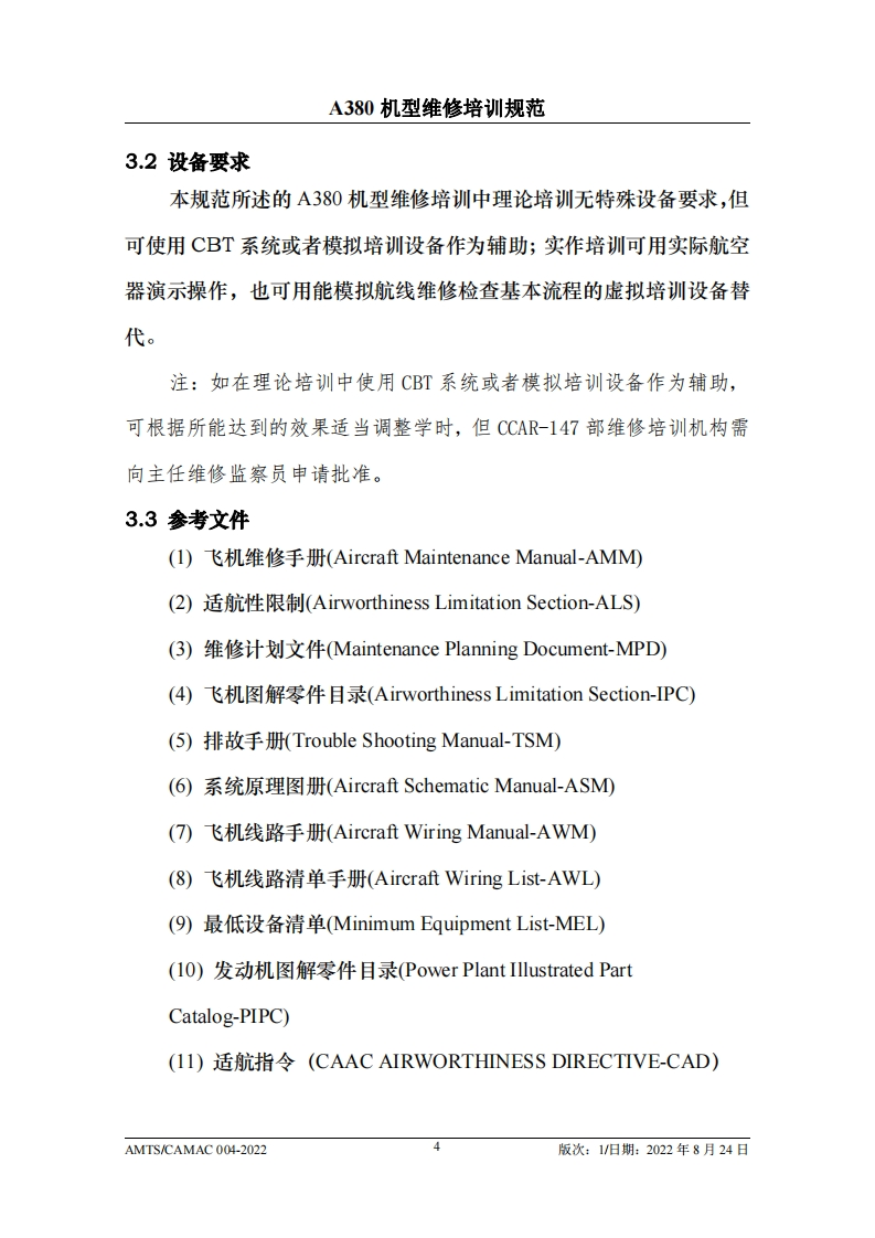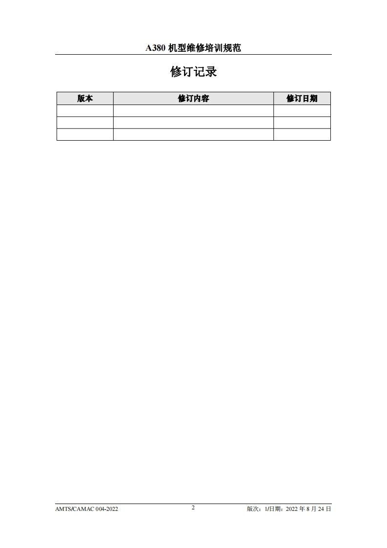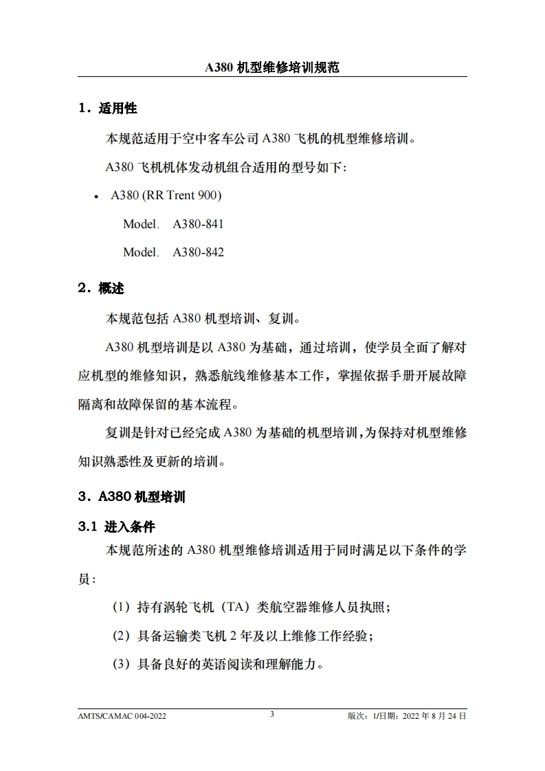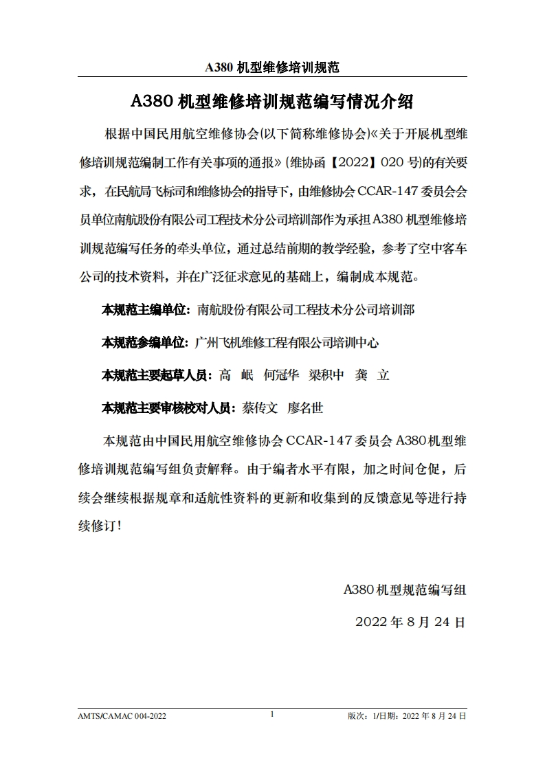 CAH光中国民用航空维修协会A380机型维修培训规范AMTS/CAMAC 004-2022第1版/2022年8月24日本文件由中国民用航空维修协会民航维修培训机构工作委员会(CCAR-147委员会)编制,并经中国民用航空局航空器评审组(AEG)的认可。航空运营人、维修单位或维修培训机构在开展机型维修培训时可参考本文件制定相应的机型维修培训教学大纲。本文件将根据A380机型的设计更改和使用反馈进行修订,请上述相关方予以及时关注,以评估对所编制教学大纲的影响。