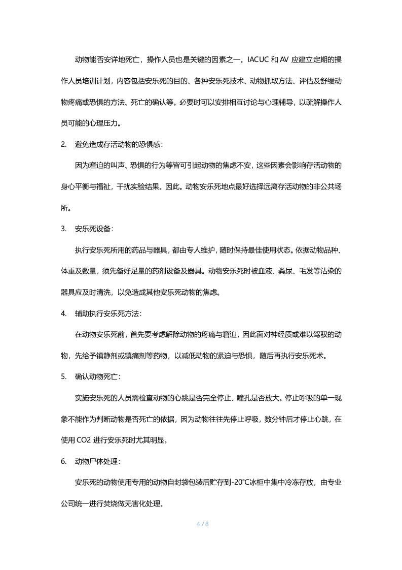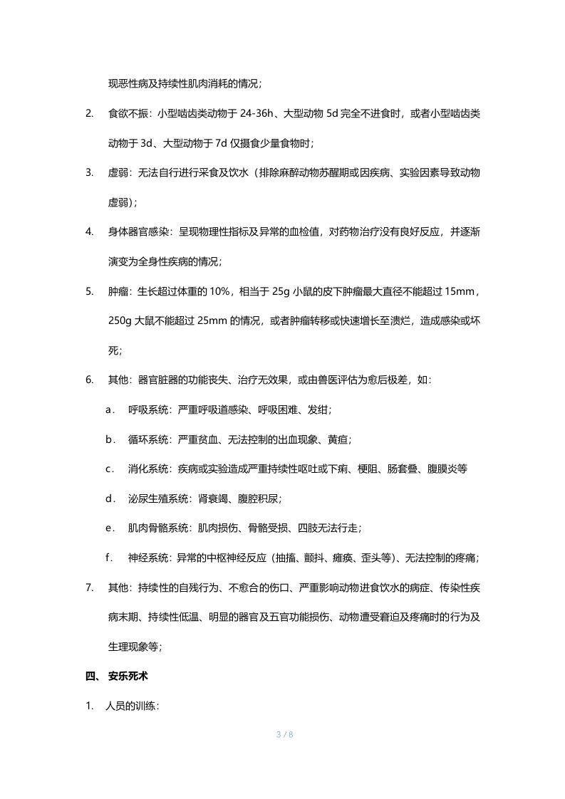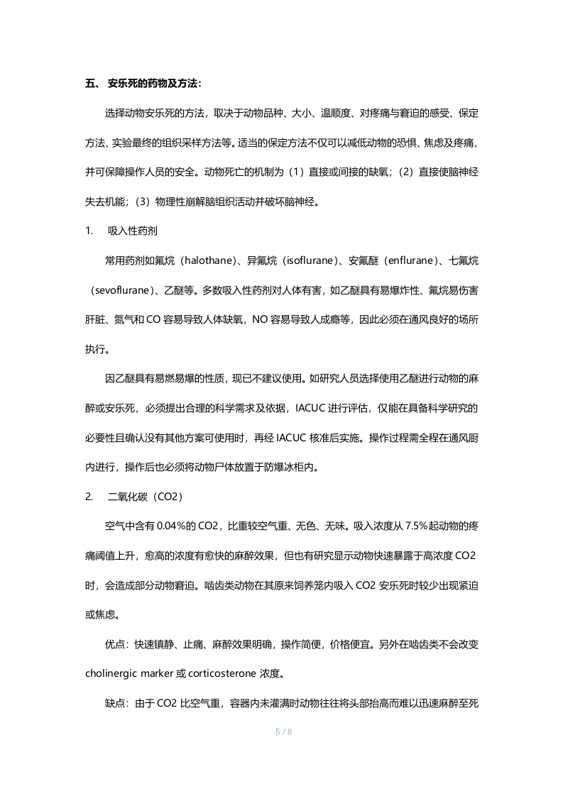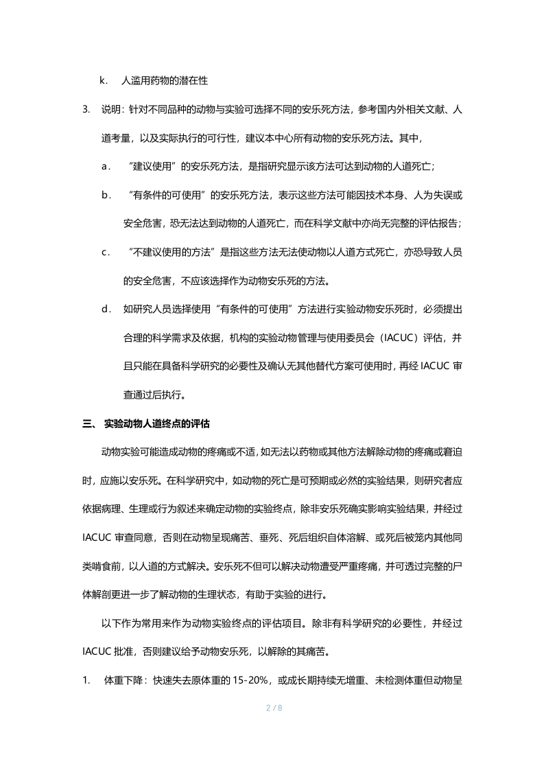 实验动物人道终点的评估与安乐死术一、目的:为维护实验动物的福利与健康,给出实验动物人道终点的判定原则标准,并施以人道的方式使动物死亡,使动物在最低程度的疼痛、恐惧,并在最短的时间内失去知觉和痛觉。二、关于安乐死:1.给予实验动物安乐死常因下列几种因素:a.实验的终结b.因研究所需提供血液或淇他组织器官C.当动物的疼痛与窘迫程度超过预期程度以上d.因动物健康及福祉考量e.不适合继续做繁育2.选择安乐死的药物方法有几项准则:a.使动物无疼痛、窘迫、焦虑、不安地失去知觉直到死亡;b.减少动物从失去知觉至死亡所耗费的时间;c.药物与方法的可靠性d.对操作人员的安全性e.不可逆性千.对操作和观察人员情绪上的影响9·对不同品种、年龄与健康状况动物的适合性h.对不同实验需求和目的的适合性i.设备的取得及维护的便利性j对环境的卫生1/8
