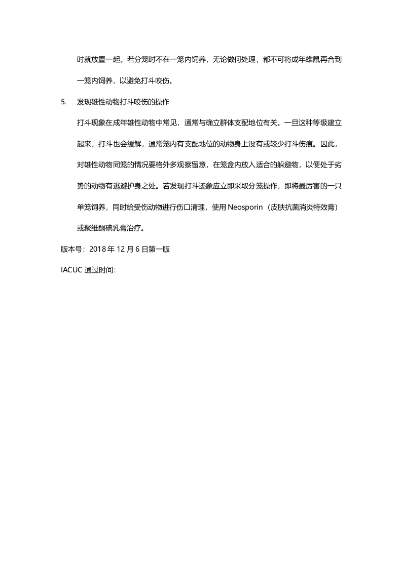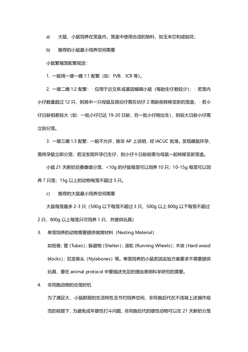 大、小鼠环境丰富化标准操作规范(SOP)目的背景:规范化大、小鼠环境丰富化程序(Environmental Enrichment Program),提供给大、小鼠最基本的行为需求,促进动物种系特有的特性,呵护了动物的生理和精神健康,进而保障了动物福利。环境丰富化必须是符合动物生理行为的,比如躲藏、社会性、探索等,新的丰富化材料和设备必须得到P1和兽医的同意后方可使用。要求所有动物照料者和实验人员对大、小鼠能够正确的对待,熟悉动物环境丰富化方案。二适用范围:西湖大学实验动物中心所有IACUC审查通过的Animal Protocols三、丰富化材料:做窝材料(Nesting Material)、纸卷、管(Tubes)、躲避物(Shelter)、木块(Hardwood blocks)等。四、操作规范:1.为满足大、小鼠的社会性需要每笼至少2只成对或成组饲养,总数不超5只。当存在如下情况时,可以单笼饲养大、小鼠:a)争斗造成咬伤,特别是到了育龄期b)为了便于医学治疗c)依据品系特性,怀孕的雌鼠d充足的科学研究理由2.饲养体系