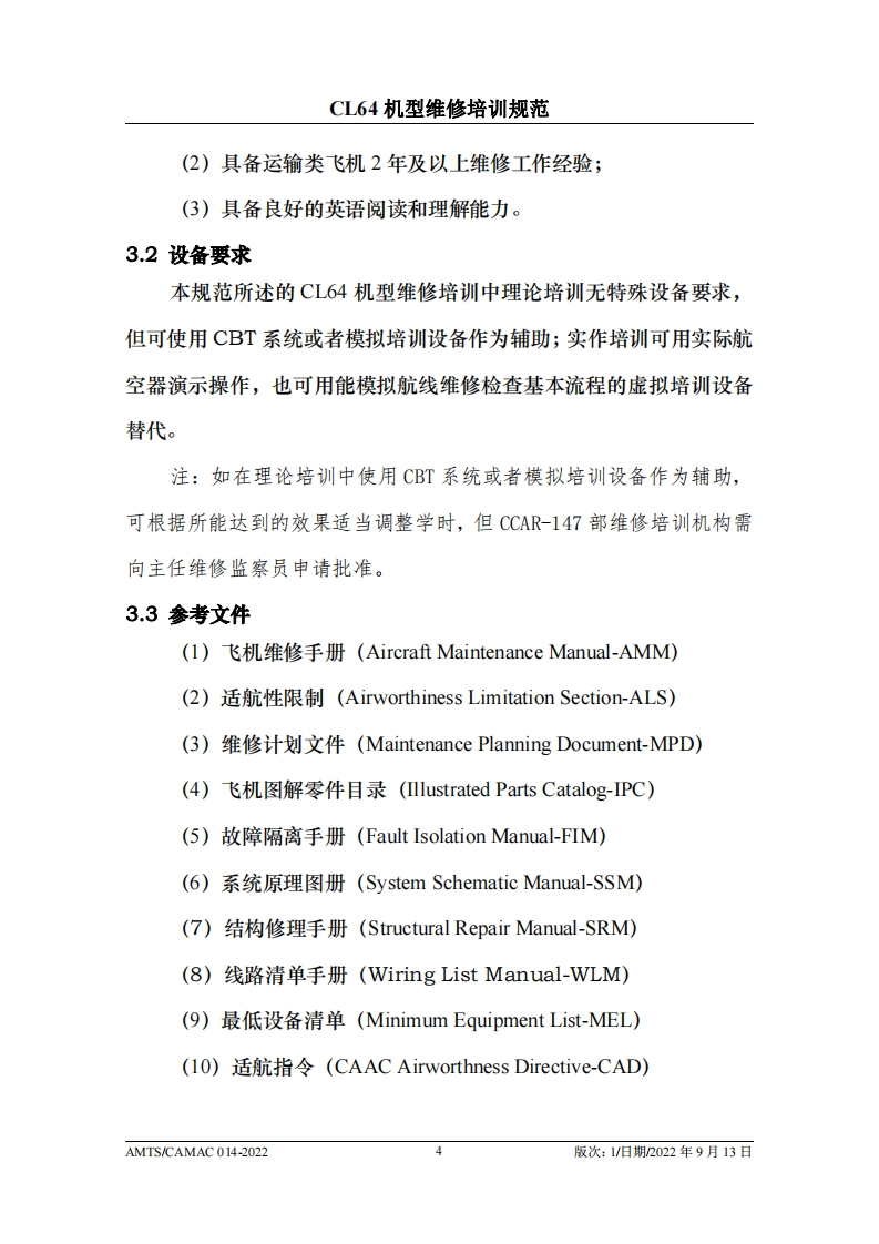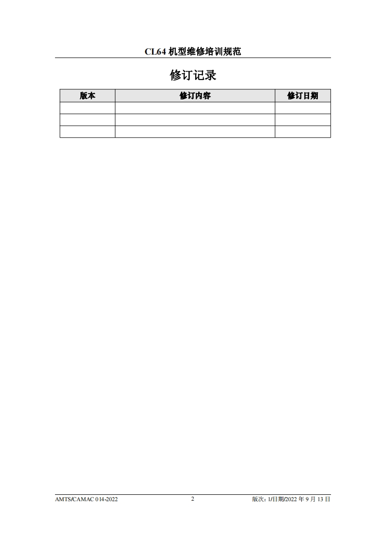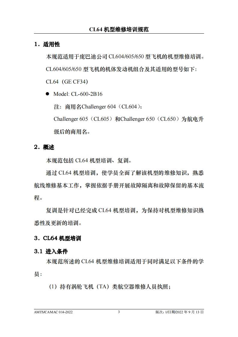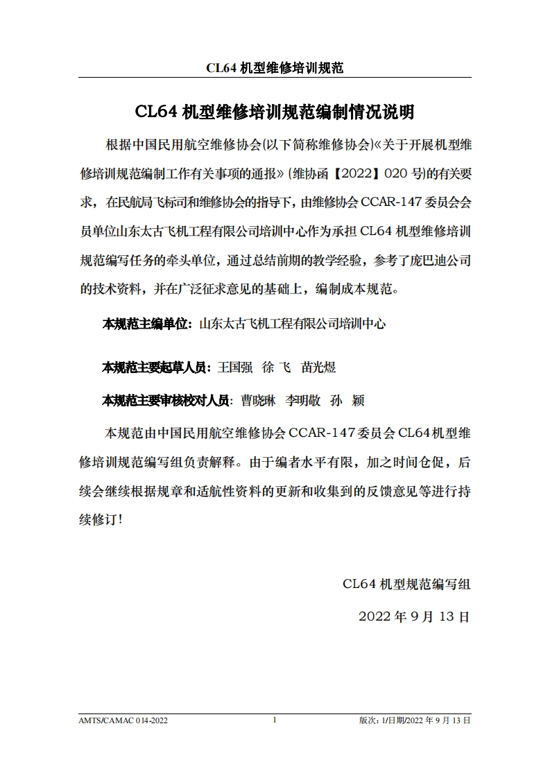 CAMEE中国民用航空维修协会CL64机型维修培训规范AMTS/CAMAC 014-2022第1版/2022年9月13日本文件由中国民用航空维修协会民航维修培训机构工作委员会(CCAR-147委员会)编制,并经中国民用航空局航空器评审组(AEG)的认可。航空运营人、维修单位或维修培训机构在开展机型维修培训时可参考本文件制定相应的机型维修培训教学大纲。本文件将根据CL64机型的设计更改和使用反馈进行修订,请上述相关方予以及时关注,以评估对所编制教学大纲的影响。