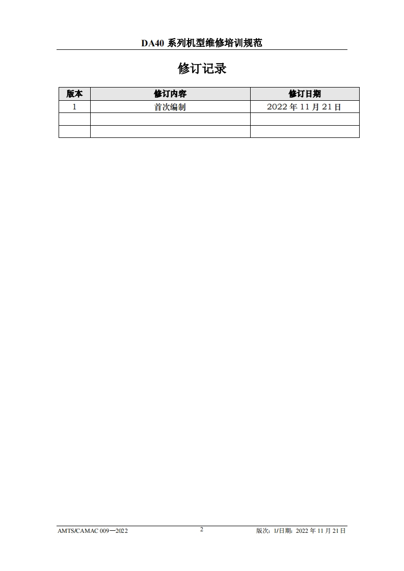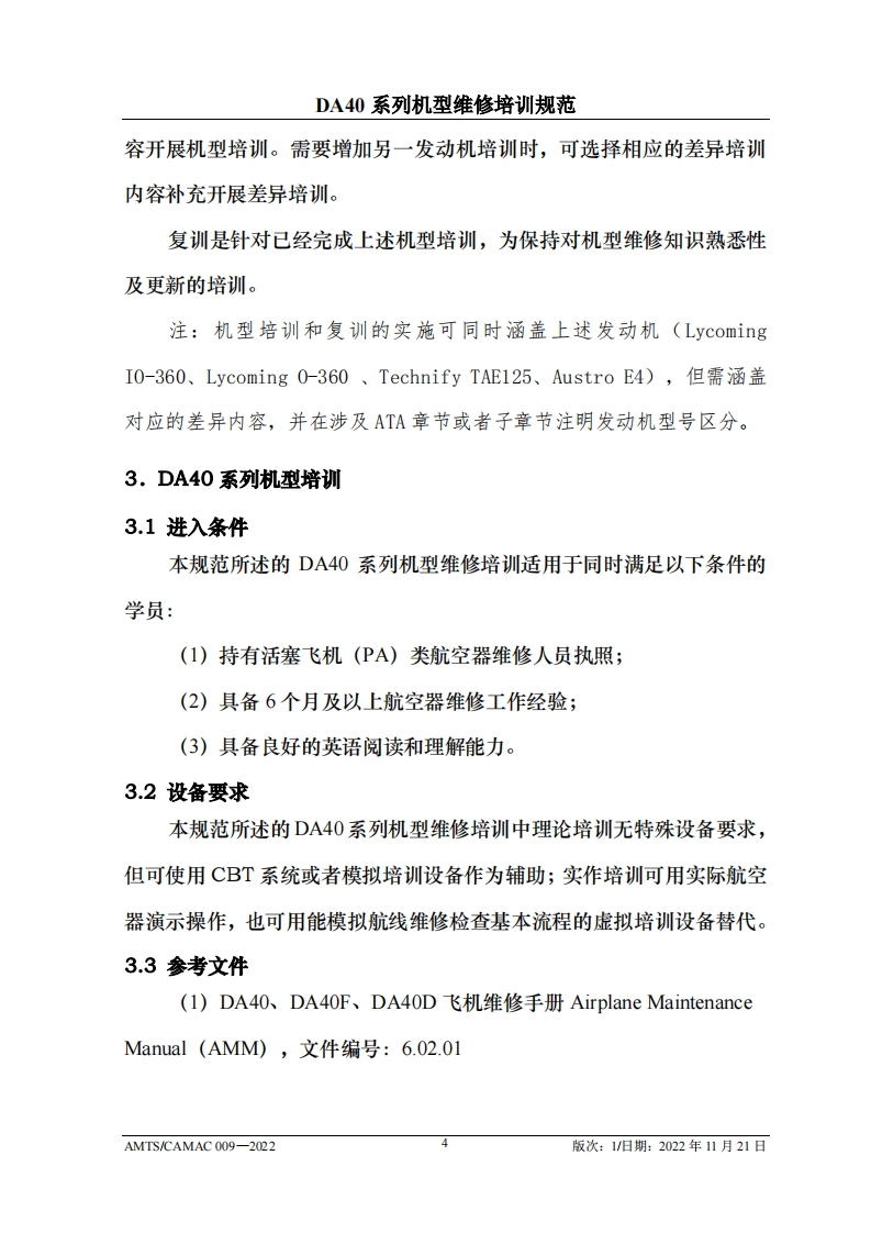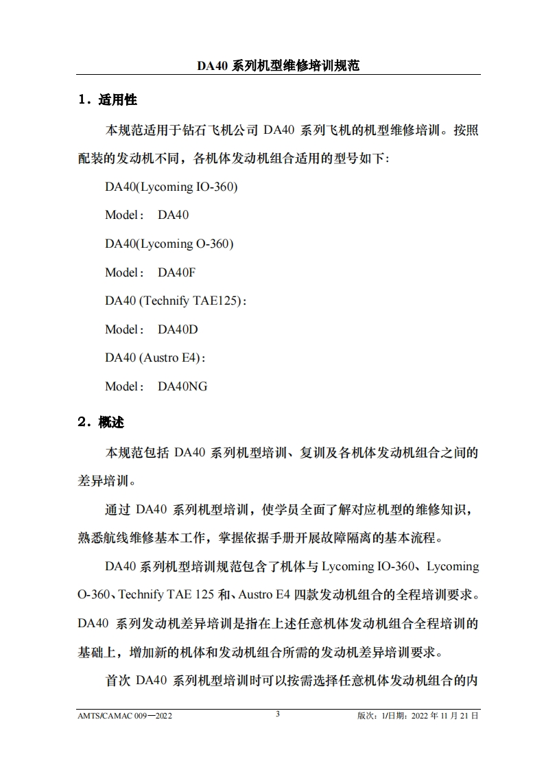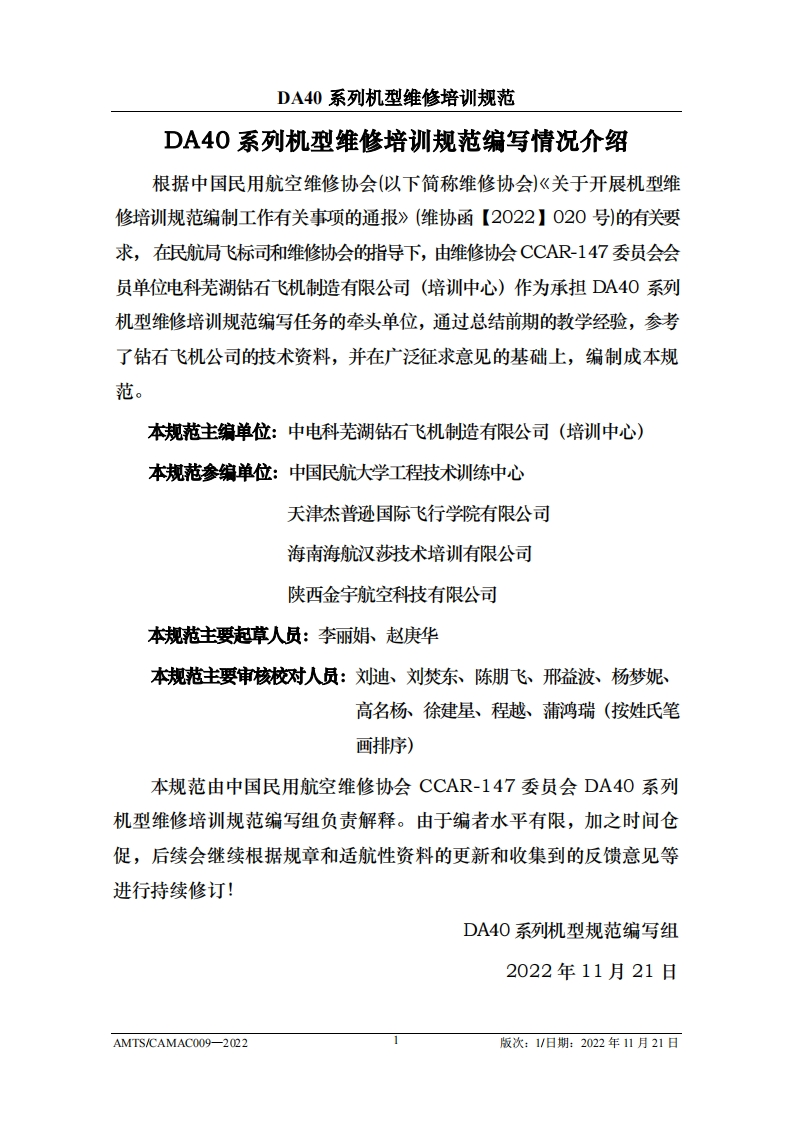 CAM光中国民用航空维修协会DA40系列机型维修培训规范AMTS/CAMAC 009-2022第1版/2022年11月21日文件由中国民用航空维修协会民航维修培训机构工作委员会(CCAR-147委员会)编制,并经中国民用航空局航空器评审组(AEG)的认可。航空运营人、维修单位或维修培训机构在开展机型维修培训时可参考本文件制定相应的机型维修培训教学大纲。本文件将根据DA40系列机型的设计更改和使用反馈进行修订,请上述相关方子以及时关注,以评估对所编制教学大纲的影响。