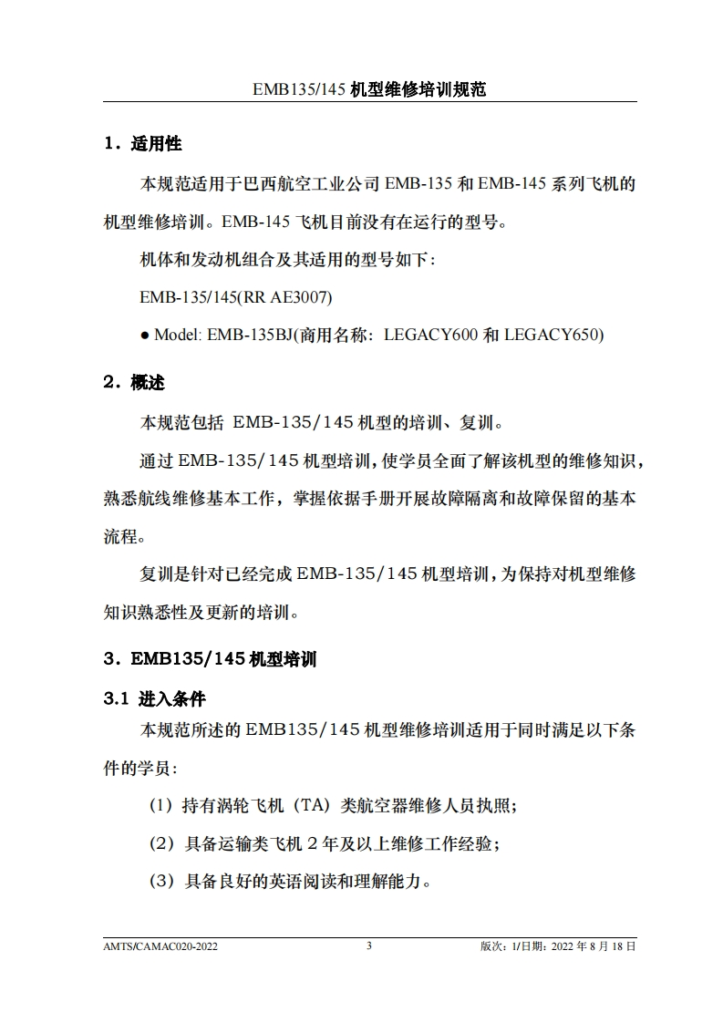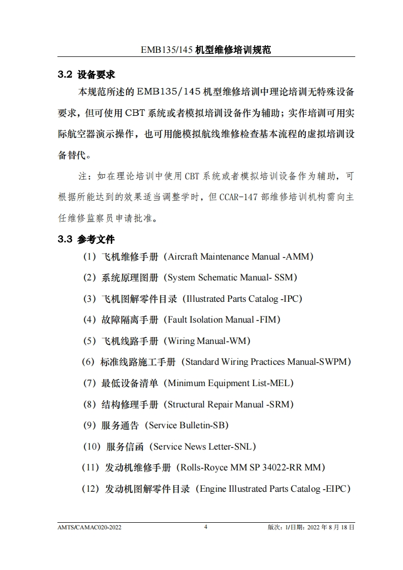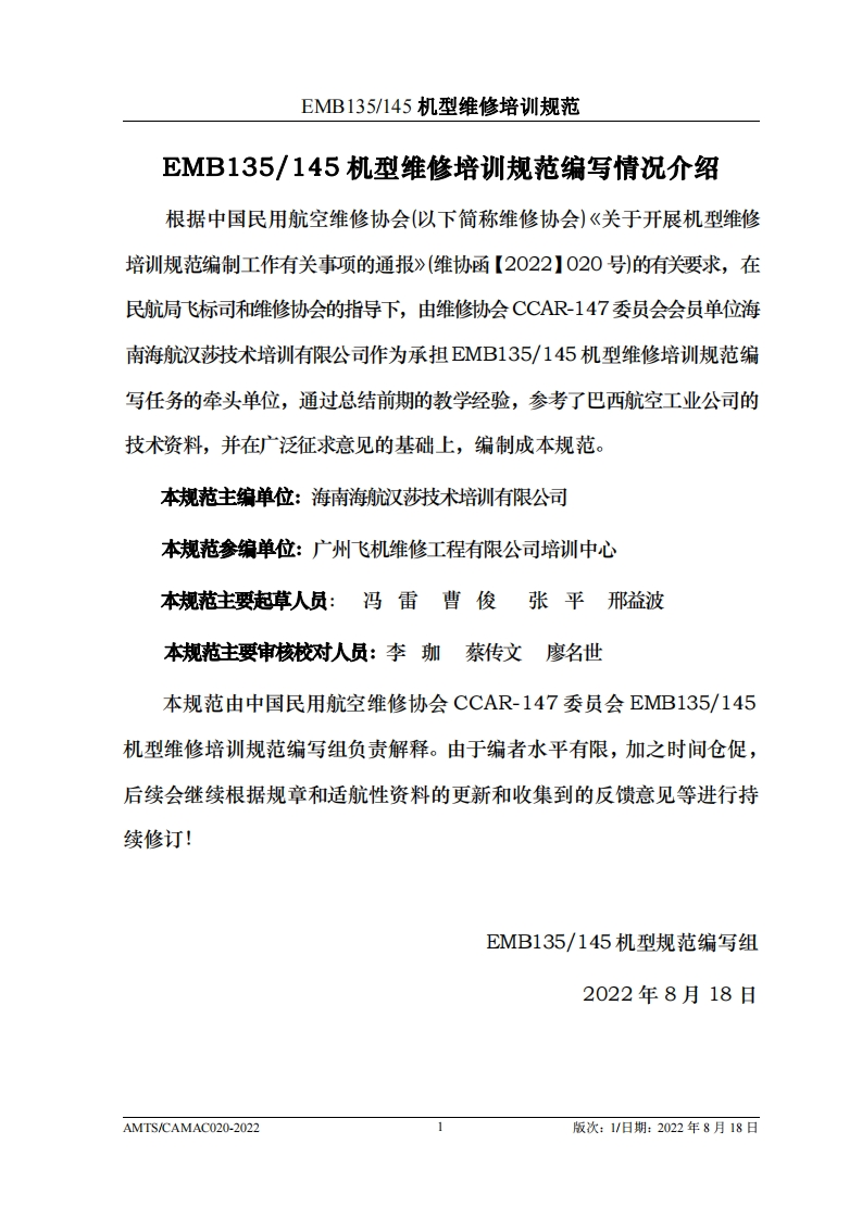 CA光中国民用航空维修协会EMB135/145机型维修培训规范AMTS/CAMAC 020-2022第1版/2022年8月18日文件由中国民用航空维修协会民航维修培训机构工作委员会(CCAR-147委员会)编制,并经中国民用航空局航空器评审组(AEG)的认可。航空运营人、维修单位或维修培训机构在开展机型维修培训时可参考本文件制定相应的机型维修培训教学大纲。本文件将根据EB135/145机型的设计更改和使用反馈进行修订,请上述相关方子以及时关注,以评估对所编制教学大纲的影响。