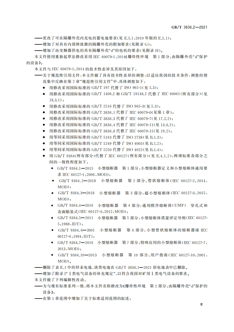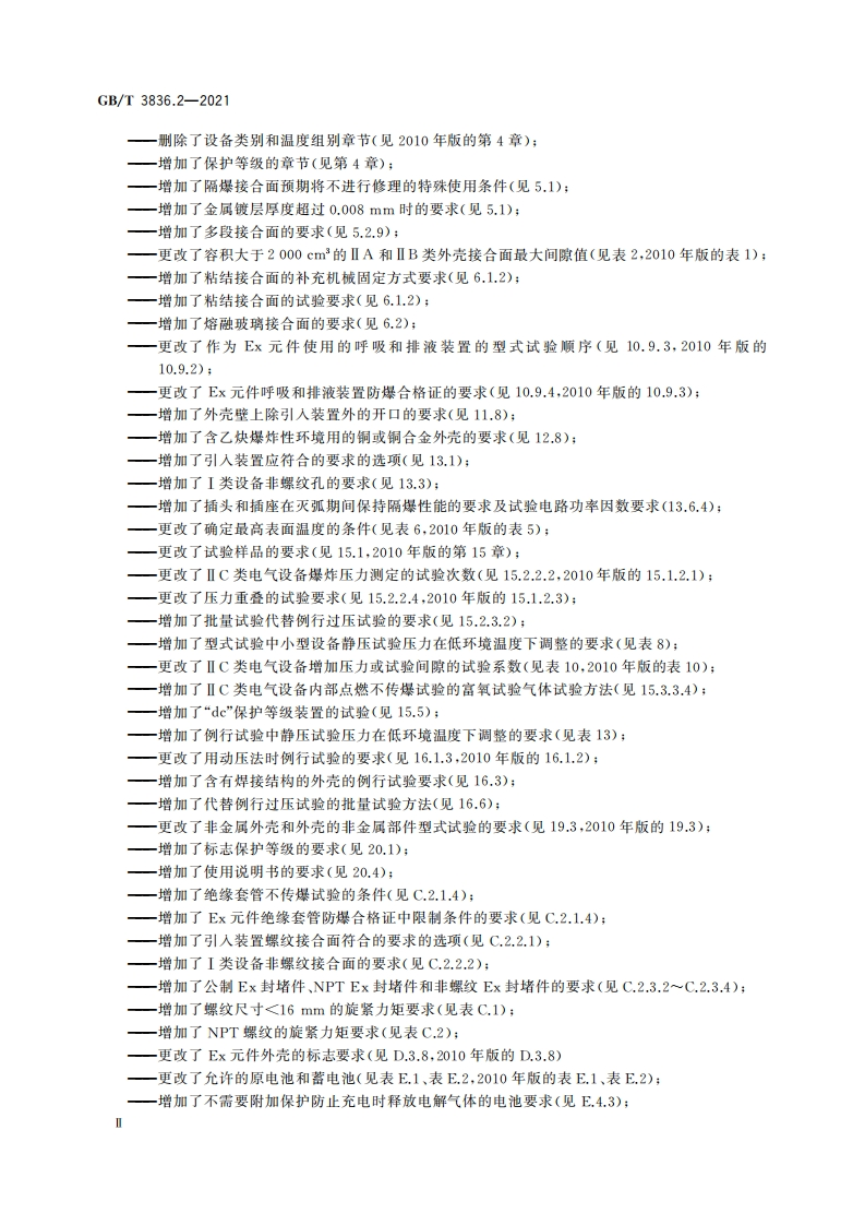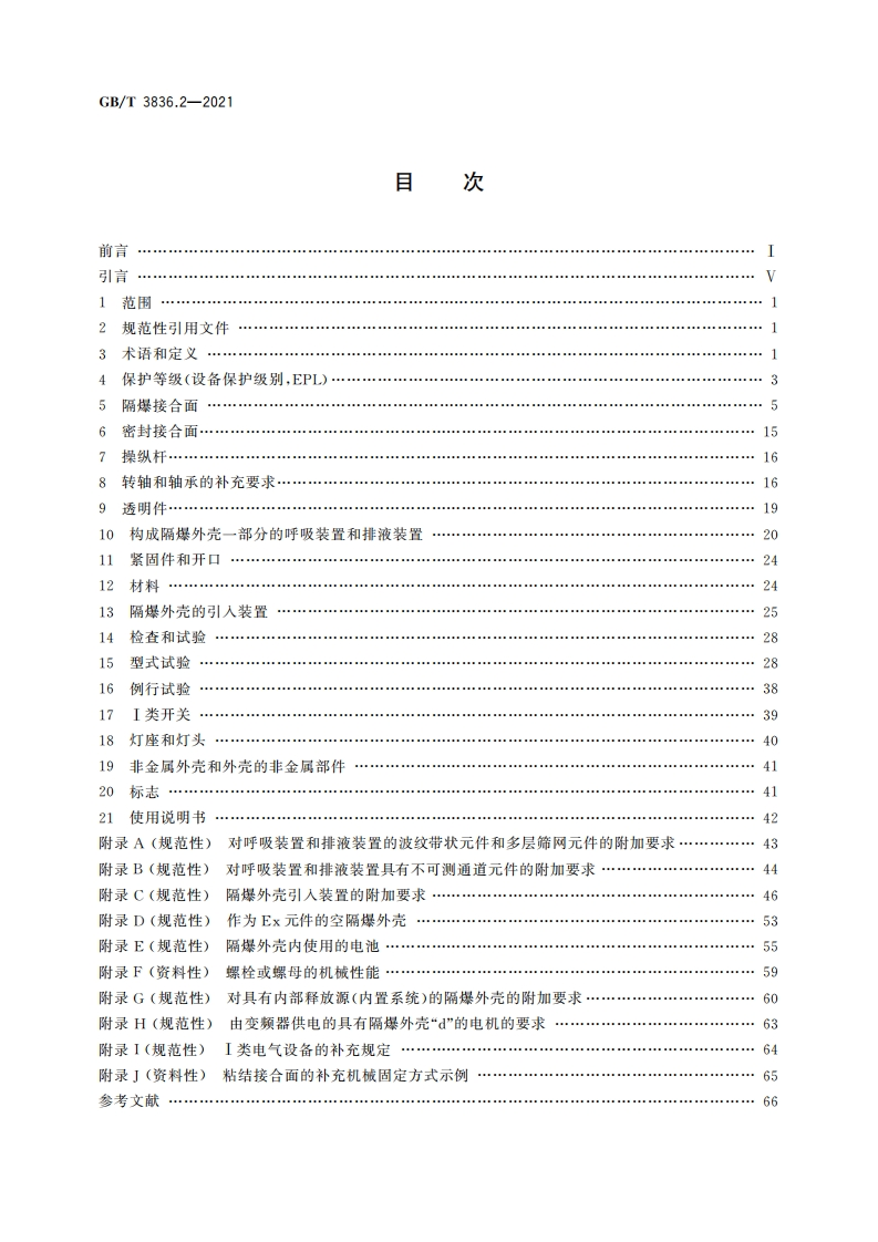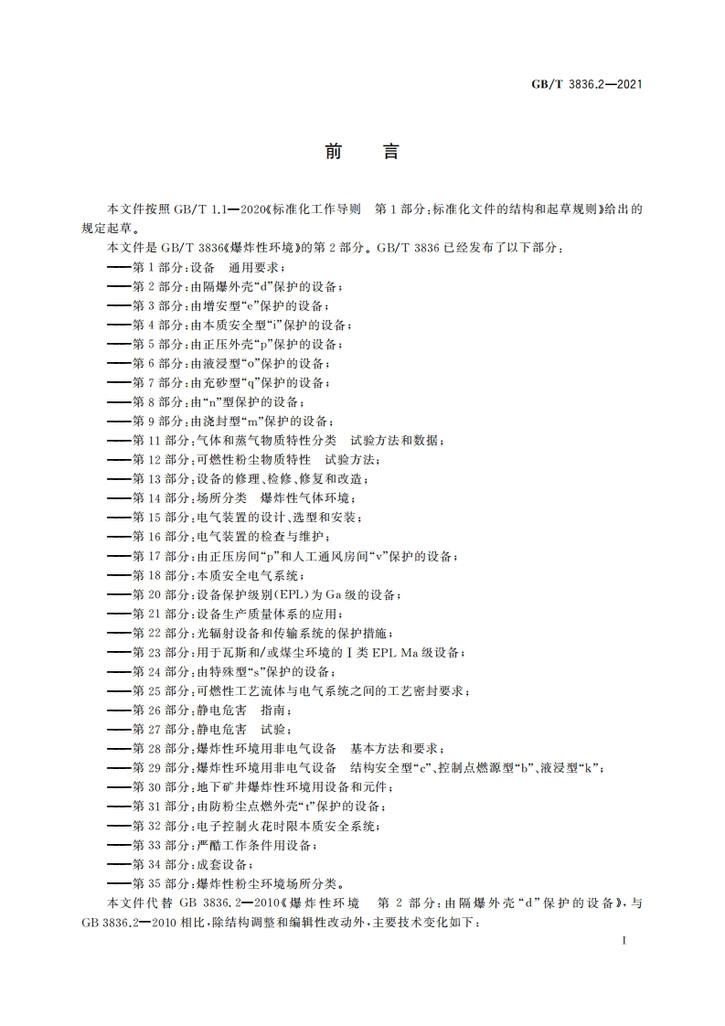 ICS29.260.20CCS K 35中华人民共和国国家标准GB/T3836.2一2021代替GB3836.2一2010爆炸性环境第2部分:由隔爆外壳“d”保护的设备Explosive atmospheres-Part 2:Equipment protection by flameproof enclosures "d"(IEC 60079-1:2014,Explosive atmospheres-Part 1:Equipment protection by flameproof enclosures "d",MOD)2021-10-11发布2022-05-01实施国家市场监督管理兽局发布国家标准化管理委员会