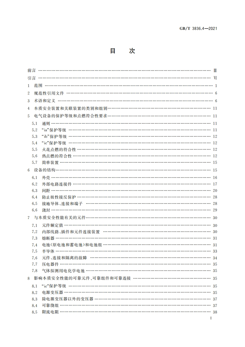 ICS29.260.20CCS K 35中华人民共和国国家标准GB/T3836.4一2021代替GB3836.4-2010,GB3836.19一2010,GB12476.4一2010爆炸性环境第4部分:由本质安全型“”保护的设备Explosive atmospheres-Part 4:Equipment protection by intrinsic safety "i"(IEC 60079-11:2011,Explosive atmospheres-Part 11:Equipmentprotection by intrinsic safety“i”,MOD)2021-10-11发布2022-05-01实施国家市场监督管理兽局发布国家标准化管理委员会