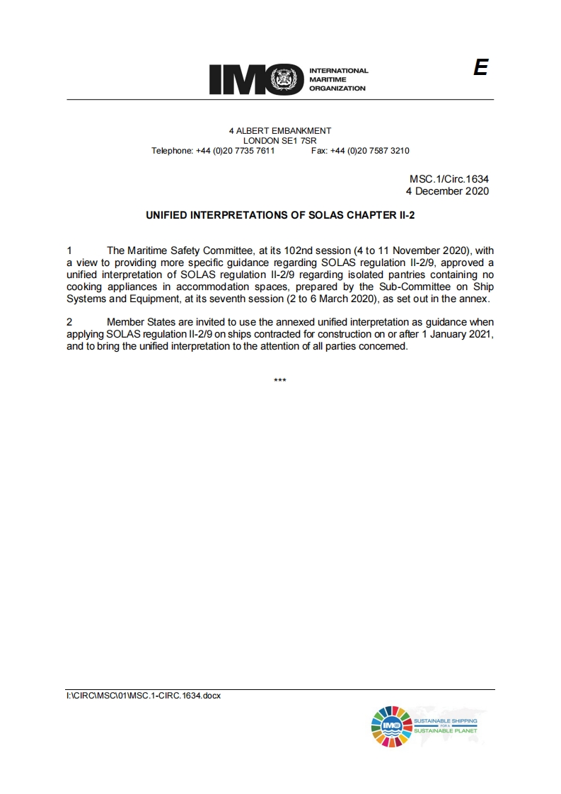 CCSTechnical Information(2021)Technical Information No.15 Total No.521Jun.29,2021(Total 1 pages +Annexes)To:Relevant ship owners,shipyards and designers,CCS surveyors,Plan ApprovalCenters,related departments of the Headquarters of CCS.Technical Notice on "Unified Interpretations Of SOLAS Chapter Il-2"(MSC.1-Circ.1634)Issued by IMOThe Maritime Safety Committee of International Maritime Organization,at its 102thsession,approved circular MSC.1/Circ.1634 "UNIFIED INTERPRETATIONS OFSOLAS CHAPTER II-2".This circular clarified "Isolated pantries containing nocooking appliances in accommodation spaces"in SOLAS regulation II-2/9.2.2.3.2.2(9)are pantries enclosed in an accommodation space and are only accessible fromaccommodation spaces and/or open deck.The circular applies to passenger ships carrying more than 36 passengers andcontracted for construction on or after 1 January 2021.The Notice is made public on CCS website (www.ccs.org.cn),and be transmitted to therelevant ship owners ,shipyards and designers by the branches/plan approval centersof CCS within their responsible area Please contact the Technology InformationDepartment of CCS for any inquiry in this regard(E-mail address:ti@ccs.org.cn).Annex:Technical Notice on "UNIFIED INTERPRETATIONS OF SOLASCHAPTERⅡ-2”(MSC.1/Circ.1634)