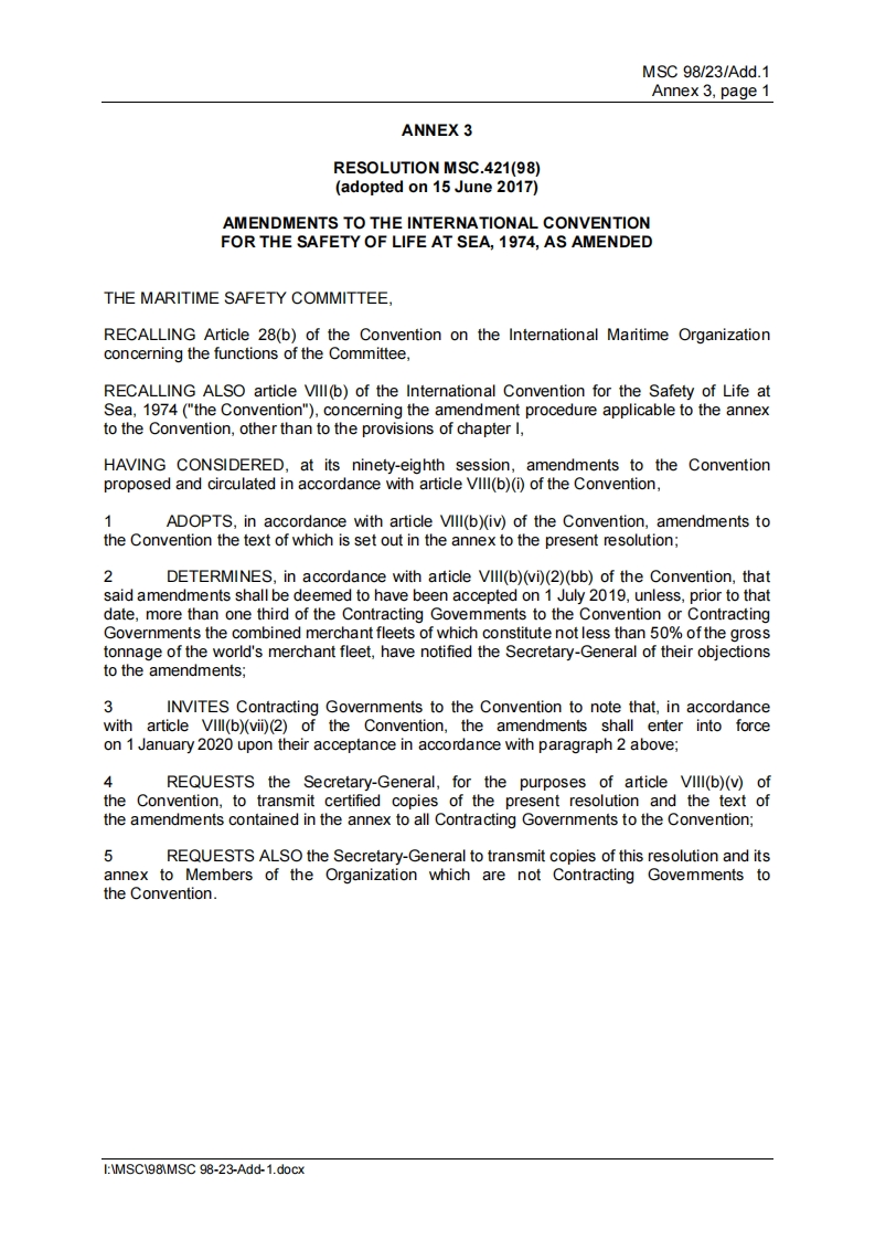 CCSTechnical Information(2018)Technical Information No.11 Total No.337Mar.13,2018(Total 1 page Annex)To:Relevant departments of the Headquarters of CCS,the Society's surveyors,PlanApproval Centers,related shipowners,ship management companies,shipyards anddesignersTechnical Notice on Amendments to 1974 SOLAS ConventionMSC.421(98))Issued by IMO1、BackgroundThe Maritime Safety Committee of International Maritime Organization (IMO)approved the Amendments to the International Convention for the Safety of Life atSea,1974,as amended.Member States are invited to note that the amendmentsshall enter into force on 1 January 2020.2.Main revisionsThe Amendments amend the damage stability criteria of chapter ll-1,requirementsabout carriage of motor vehicle of chapter ll-2,requirements about life-savingappliances in chapter Ill,and requirements about certificates in Appendix.Amongthem,the damage stability criteria raise the requirement about subdivision index R.The influence of accumulated water of bulkhead deck is required to be considered inthe damage case of ro-ro passenger ship.The damage stability of intermediate stageis also required to be calculated for cargo ships fitted with cross-flooding devices.This Notice is made public on CCS website (www.ccs.org.cn),and is to be distributedto relevant ship owner and shipping management companies by CCS branches withintheir responsible areas.Please contact Technical Management Department of CCS forany inquiry in the implementation.E-mail address:rt@ccs.org.cn.Annex:MSC.421(98)