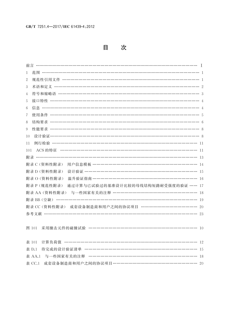1CS29.130.20K31中华人民共和国国家标准GB/T7251.4-2017/IEC61439-4:2012代替GB/T7251.4一2006低压成套开关设备和控制设备第4部分:对建筑工地用成套设备(ACS)的特殊要求Low-voltage switchgear and controlgear assemblies-Part 4:Particular requirements for assemblies for construction sites (ACS)(IEC61439-4:2012,IDT)2017-11-01发布2018-05-01实施中华人民共和国国家质量监督检验检疫总局中国国家标准化管理委员会发布