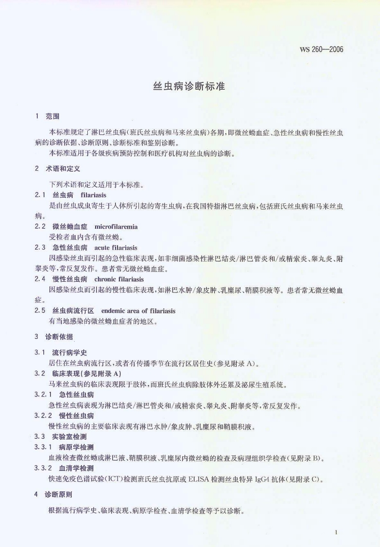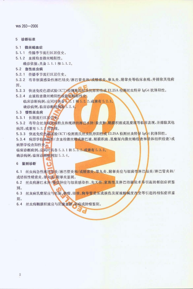 毕人民共和国卫生行业标准Ws260-2006丝虫病诊断标准Diagnosticcriteriaforfilariasis348072@abc10天前发布关注私信2.30MB11页033毕人民共和国卫生行业标准Ws260-2006丝虫病诊断标准Diagnosticcriteriaforfilariasis此内容为付费资源,请付费后查看¥19¥29黄金会员免费钻石会员免费立即购买您当前未登录!建议登陆后购买,可保存购买订单付费资源 第1页 / 共11页 第2页 / 共11页 第3页 / 共11页 第4页 / 共11页 第5页 / 共11页 试读已结束,还剩6页,您可下载完整版后进行离线阅读 THE END标准规范 文本预览 1Cs11.020c59备案号:17598-2006WS中华人民共和国卫生行业标准WS260-2006丝虫病诊断标准Diagnostic criteria for filariasis2006-04-07发布2006-12-01实施十中老人电共和国卫生郁发布 查看更多 收起部分 喜欢就支持一下吧收藏