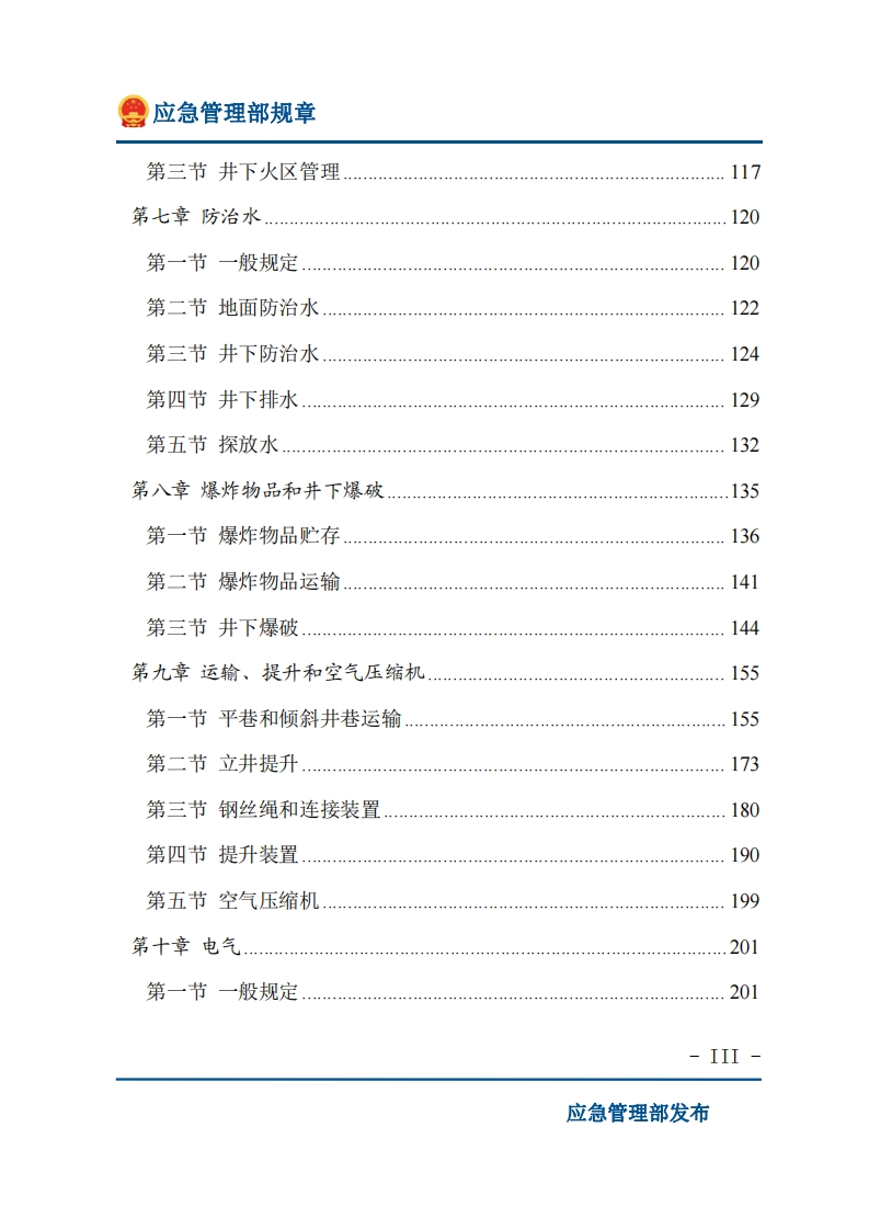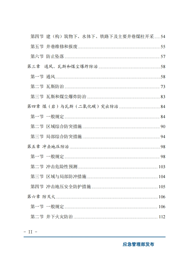 。应急管理部规章煤矿安全规程(2016年2月25日国家安全生产监督管理总局令第87号公布,自2016年10月1日起施行;根据2022年1月6日应急管理部令第8号修正)目录第一编总则.第二编地质保障811第三编井工渠.,,,,,,,第一章矿井建设11第一节一般规定.11第二节井巷掘进与支护12第三节井塔、井架及井筒装备22第四节建井期间生产及辅助系统…25第二章开采32第一节一般规定32第二节回采和顶板控制36第三节采掘机械,4444450I-应急管理部发布
