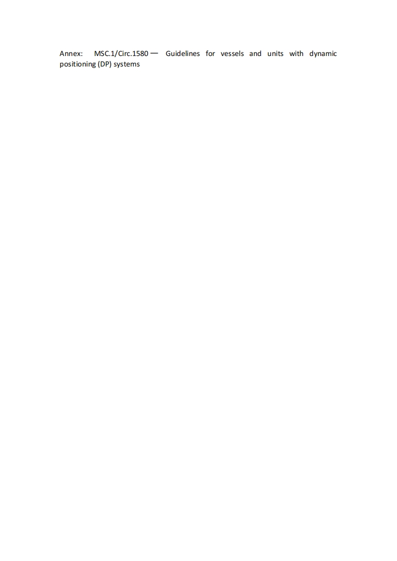 CCSTechnical Information(2020)Technical Information No.57 Total No.491Sep.01,2020(Total 2 pages)To:Relevant shipowners,ship management companies,shipyards and designers,productmanufacturer,related departments of the Headquarters of CCS,the Society's surveyors,Plan Approval CentersTechnical Notice on Guidelines for Vessels and Units with DynamicPositioning(Dp)Systems (MSC.1/Circ.1580)issued by IMOThe Maritime Safety Committee of International Maritime Organization (IMO),at itsninety-eighth session on 16 June 2017,approved the Guidelines for vessels and unitswith dynamic positioning(DP)systems(MSC.1/Circ.1580)MSC.1/Circ.1580 recommends that the above mentioned Guideline should be appliedto vessels and units constructed on or after 9 June 2017.For vessels and unitsconstructed on or after 1 July 1994 but before 9 June 2017,the previous version of theGuidelines (MSC/Circ.645)may continue to be applied,however it is recommendedthat section 4 of the above mentioned Guideline be applied to all new and existingvessels and units,as appropriate.MSC.1/Circ.1580 is provided in the annex of this technical notice.This technical notice is made public on CCS website (www.ccs.org.cn),and is to bedistributed to relevant ship owners,shipyards,design units and shippingmanagement companies by CCS branches within their responsible areas.Pleasecontact Technology Information Department of CCS (ti@ccs.org.cn)for any inquiryin the implementation.