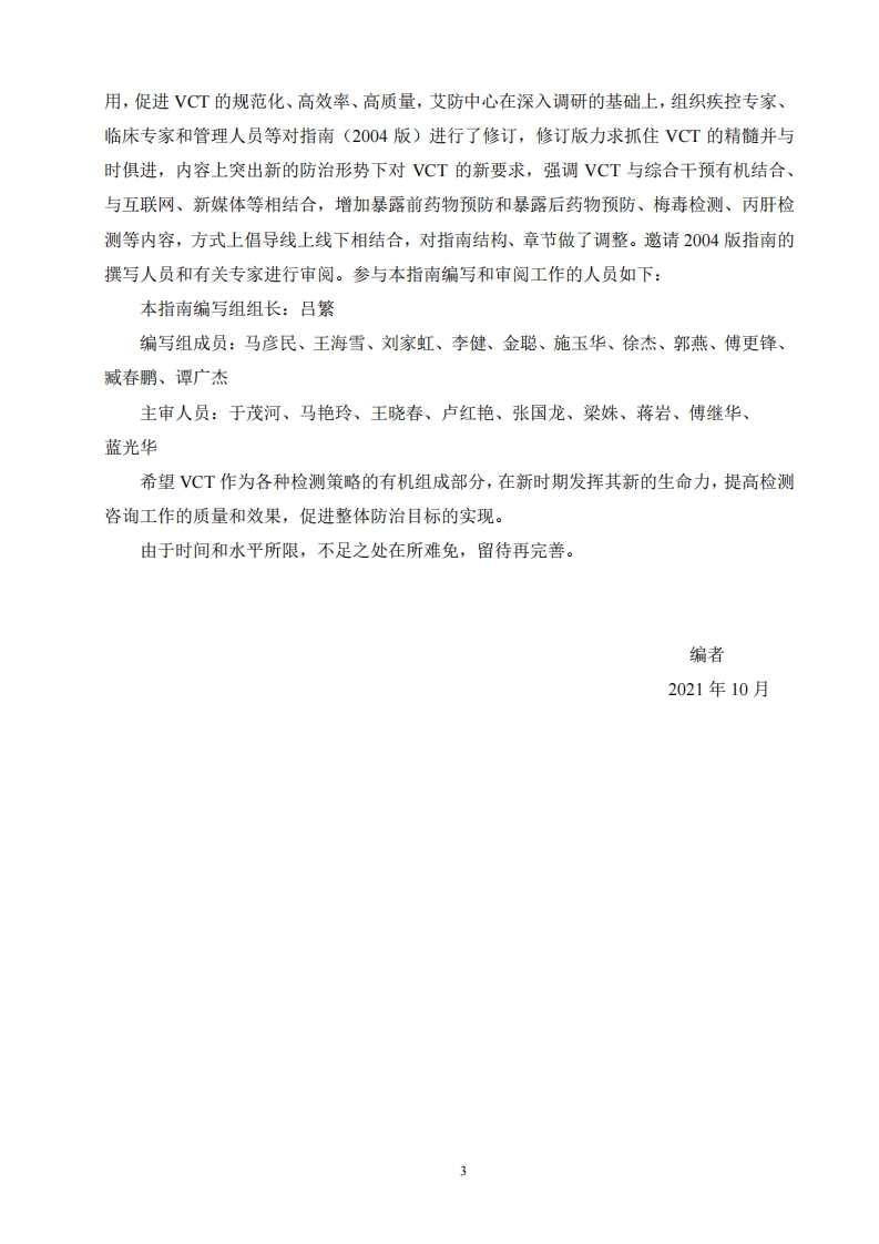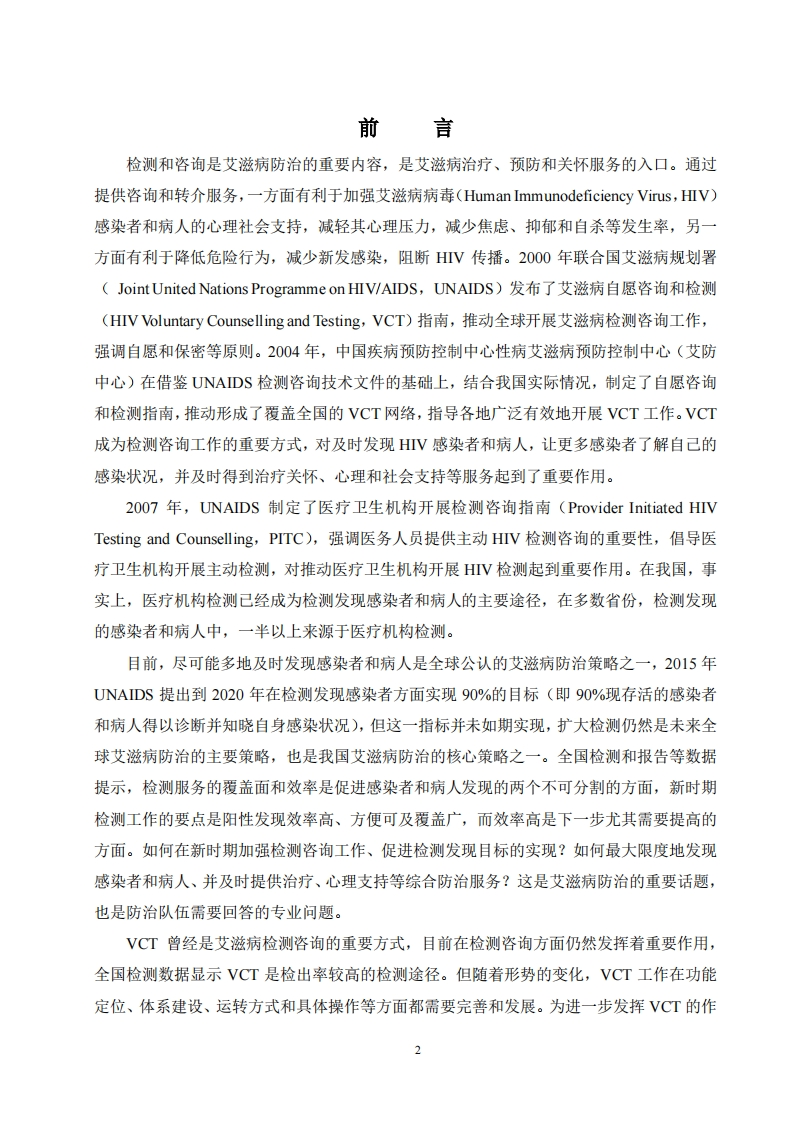 艾滋病自愿咨询检测工作指南(2021版)348072@abc9天前发布关注私信1.31MB52页030艾滋病自愿咨询检测工作指南(2021版)此内容为付费资源,请付费后查看¥19¥29黄金会员免费钻石会员免费立即购买您当前未登录!建议登陆后购买,可保存购买订单付费资源 第1页 / 共52页 第2页 / 共52页 第3页 / 共52页 第4页 / 共52页 第5页 / 共52页 试读已结束,还剩47页,您可下载完整版后进行离线阅读 THE END标准规范 文本预览 艾滋病自愿咨询检测工作指南(2021版)中国疾病预防控制中心性病艾滋病预防控制中心二O二一年十月 查看更多 收起部分 喜欢就支持一下吧收藏