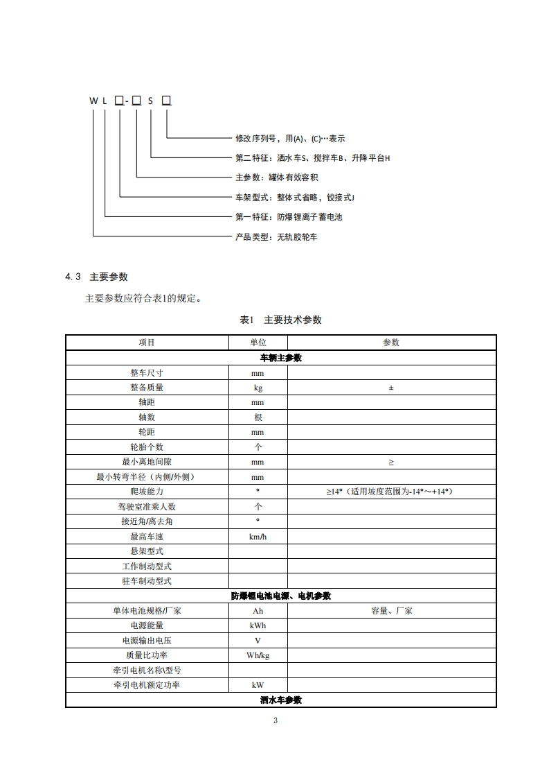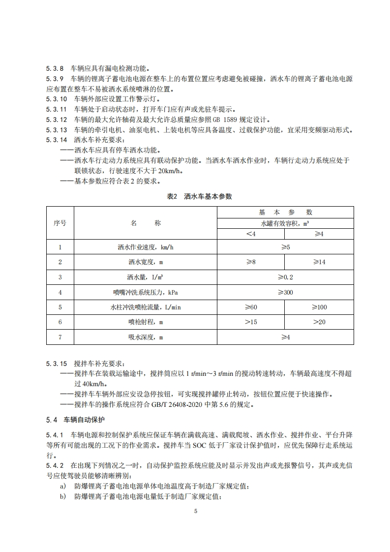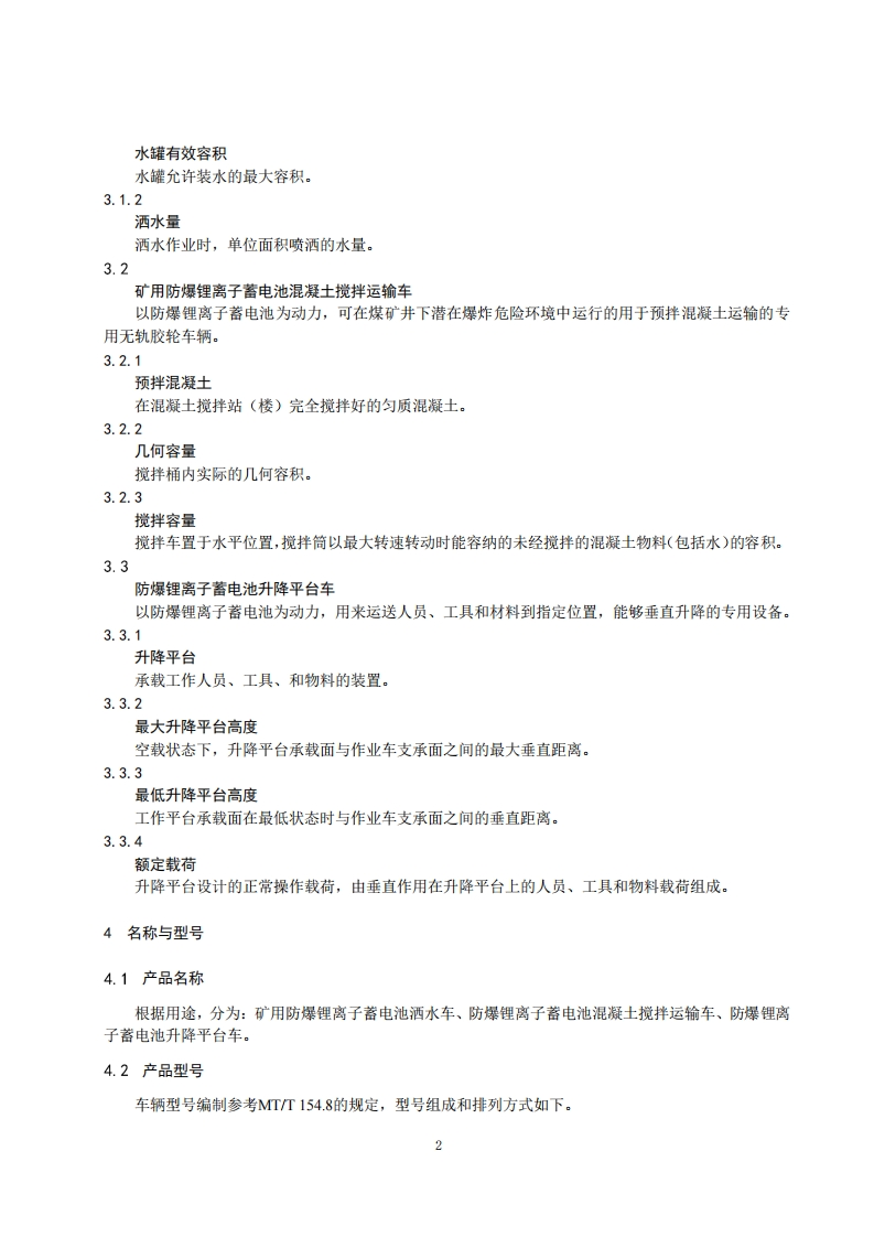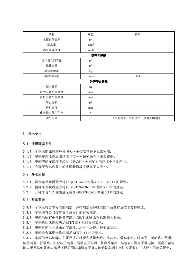 防爆锂离子蓄电池特种作业车辆安全技术要求(试行)1范围本要求规定了煤矿井下用防爆锂离子蓄电池洒水车(以下简称洒水车)、防爆锂离子蓄电池混凝士搅拌运输车(以下简称为搅拌车)、防爆锂离子蓄电池升降平台车(以下简称升降平台车)的安全技术要求。2规范性引用文件下列文件中的内容通过文中的规范性引用而构成本文件必不可少的条款.其中,注日期的引用文件,仅该日期对应的版本适用于本文件:不注日期的引用文件,其最新版本(包括所有的修改单)适用于本文件。《煤矿用防爆锂离子蓄电池无轨车辆安全技术要求》(试行)GB/T3836.1爆炸性环境第1部分:设备通用要求GB/T3836.2爆炸性环境第2部分:由隔爆外壳“”保护的设备GB/T3836.3爆炸性环境第3部分:由增安型“e”保护的设备GB/T3836.4爆炸性环境第4部分:由本质安全型“”保护的设备GB/T3836.9爆炸性气体环境用电气设备第9部分:浇封型“m”GB7258机动车运行安全技术要求GB/T9465高空作业车GB/T12674汽车质量(重量)参数测定方法GB18384电动汽车安全要求GB25849移动式升降工作平台设计计算、安全要求和测试方法GB/T26408混凝土搅拌运输车MT113煤矿井下用聚合物制品阻燃抗静电性通用试验方法和判定规则MTT154.8煤矿辅助运输设备型号编制方法MT818煤矿用电缆系列标准QCT54-2006洒水车《煤矿安全规程》(2022年版)3术语和定义下列术语和定义适用于本文件。3.1防爆锂离子蓄电池洒水车以防爆锂离子蓄电池为动力,用于煤矿井下洒水、降尘、冲洗的专用无轨胶轮车辆。3.1.1
