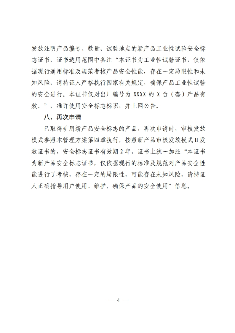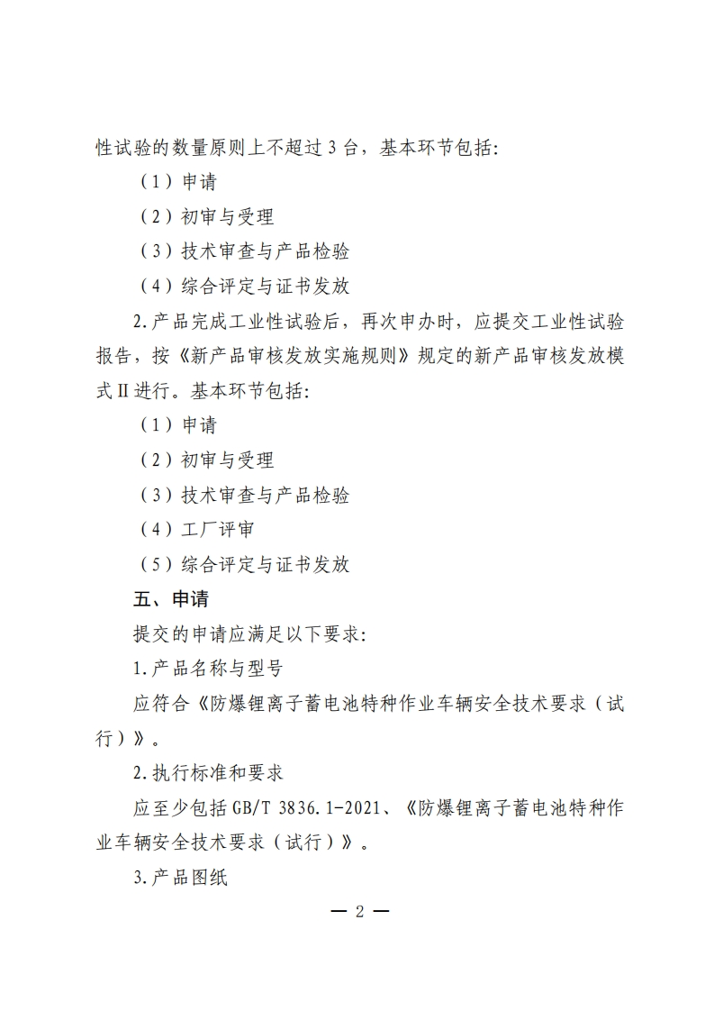 防爆裡离子蓄电池特种作业车辆安标管理方案(试行)为进一步规范防爆锂离子蓄电池特种作业车辆安标审核发放,根据矿用产品安全标志管理有关规定及防爆锂离子蓄电池特种作业车辆的技术特点,经广泛调查研究、征求相关检测中心和生产企业意见建议及讨论后,制订本方案。一、适用范围本方案适用于煤矿井下以防爆锂离子蓄电池为动力的无轨特种作业车辆,主要包括洒水车、混凝土搅拌车、升降平台车等。二、产品名称、型号与主要依据标准产品名称和型号按《防爆锂离子蓄电池特种作业车辆安全技术要求(试行)》有关要求执行。主要依据标准:GB/T3836.1-2021、GB/T3836.2-2021、GB/T3836.4-2021、《防爆锂离子蓄电池特种作业车辆安全技术要求》。三、申请人基本要求申请人应符合《矿用产品安全标志审核发放实施规则防爆柴油机无轨车》“4申请人应具备的条件”的相关要求。四、审核发放模式1.申办企业未取得过同类型相关产品的安标证书,首次申请按新产品审核发放模式I实施。申请同一规格型号产品进行工业一1一