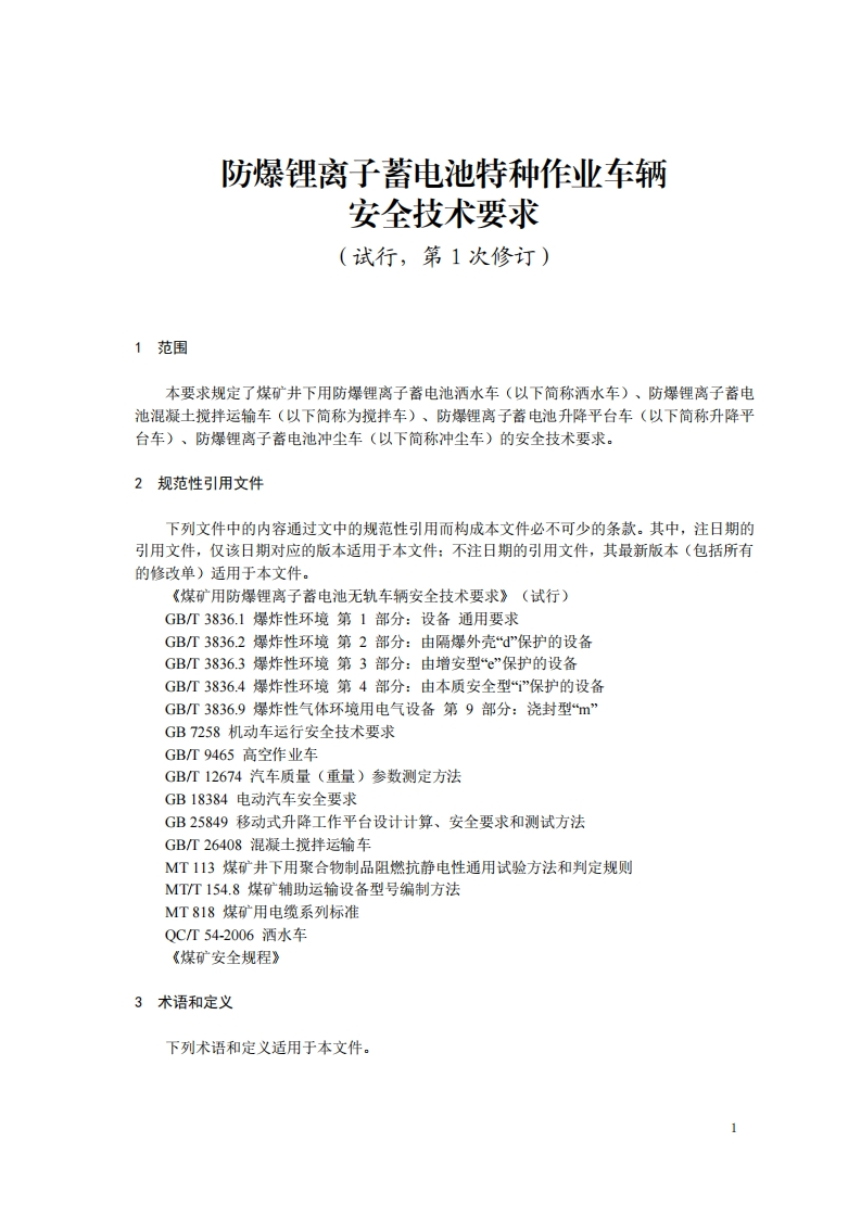 防爆裡离子蓄电池特种作业车辆安标管理方案(试行,第一次修订)为进一步规范防爆锂离子蓄电池特种作业车辆安标审核发放,根据矿用产品安全标志管理有关规定及防爆锂离子蓄电池特种作业车辆的技术特点,经广泛调查研究、征求相关检测中心和生产企业意见建议及讨论后,制订本方案。一、适用范围本方案适用于煤矿井下以防爆锂离子蓄电池为动力的无轨特种作业车辆,主要包括洒水车、混凝土搅拌车、升降平台车、冲尘车等。二、产品名称、型号与主要依据标准产品名称和型号按《防爆锂离子蓄电池特种作业车辆安全技术要求(试行)(第1次修订)》有关要求执行。主要依据标准:GB18384-2020、GB/T3836.1-2021、GB/T3836.2-2021、GB/T3836.4-2021、《防爆锂离子蓄电池特种作业车辆安全技术要求(试行)(第1次修订)》。三、申请人基本要求申请人应符合《矿用产品安全标志审核发放实施规则防爆柴油机无轨车》“4申请人应具备的条件”的相关要求。四、审核发放模式一1