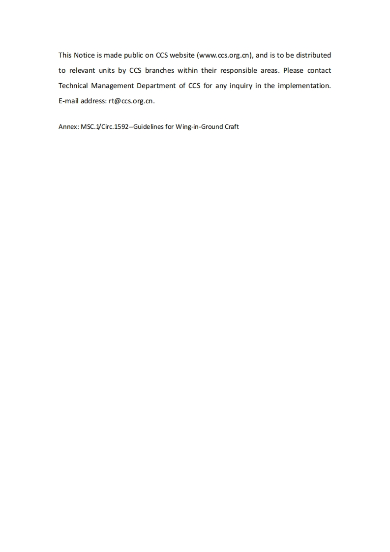 CCSTechnical Information(2019)Technical Information No.12 Total No.406Apr02,2019(Total 2 pages Annex)To:Relevant departments of CCS Headquarters,CCS site surveyors,CCS plan approval centers,shipowners,shipyards,products manufacturers and designersTechnical notice on Guidelines for Wing-in-Ground Craft(MSC.1/Circ.1592)issued by IMO1.IntroductionThe Maritime Safety Committee,at its ninety-ninth session (May 2018),approved theMSC.1/Circ.1592 "Guidelines for Wing-in-Ground Craft".The guidelines are applicable toWIG craft carrying more than 12 passengers and/or having a full load displacement of morethan 10 tonnes.This circular revokes MSC/Circ.1054 and Corr.1,and MSC/Circ.1126.2.Main technical pointsThe guidelines address the two major challenges of whether to consider the development ofsafety standards for small WIG craft and the adoption of civil aviation standards.The guidelinesspecify that the guidelines are applicable to WIG craft carrying more than 12 passengersand/or having a full load displacement of more than 10 tonnes.The guidelines set out requirements for stability,construction,fire protection,lifesaving,navigational equipment and operation of WIG craft.In part B of the guidelines,the stabilitycriterion requirement of the WIG craft under the ground efficiency condition is added.The craftshall be provided with a device to measure speed and distance through air and water.Any WIGcraft operated in shallow water over 300 gross tonnages should be fitted with an echo-soundingdevice.