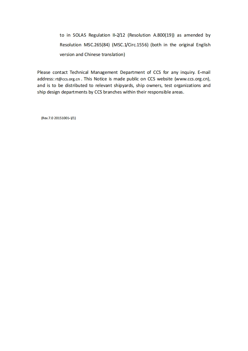 CCSTechnical Information(2017)Technical Information No.53 Total No.301Jul.31,2017(Total 2 pages)To:relevant departments of CCS Headquarters,CCS surveyors,plan approval centers,relevantship owners,shipyards and designersTechnical Notice on Implementing IMO MSC.1-Circ.1556I Foreword1.1 The Maritime Safety Committee of International Maritime Organization,at itsninety-seventh session,adopted Unified Interpretations of Chapter 8 of the FSS Codeand the Revised Guidelines for Approval of Sprinkler Systems Equivalent to ThatReferred to in SOLAS Regulation ll-2/12 (Resolution A.800(19))as amended byResolution MSC.265(84)(MSC.1/Circ.1556)on 21 November 2016.1.2 The circular applies to all passenger ships and cargo ships of 500 gross tonnageand over from its issuance date of 25 November 2016.II Technical points2.1 Main contents of MSC.1/Circ.1556With regard to Chapter 8 of the FSS Code and the Revised Guidelines for Approval ofSprinkler Systems Equivalent to That Referred to in SOLAS Regulation ll-2/12(Resolution A.800(19))as amended by Resolution MSC.265(84),the calculationmethod of parameters of sprinkler pumps and pressure tanks is clarified.AnnexUnified Interpretations of Chapter 8 of the FSS Code and the RevisedGuidelines for Approval of Sprinkler Systems Equivalent to That Referred