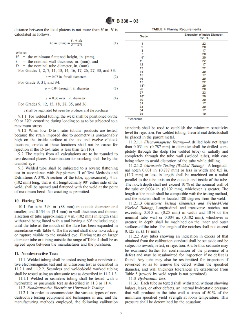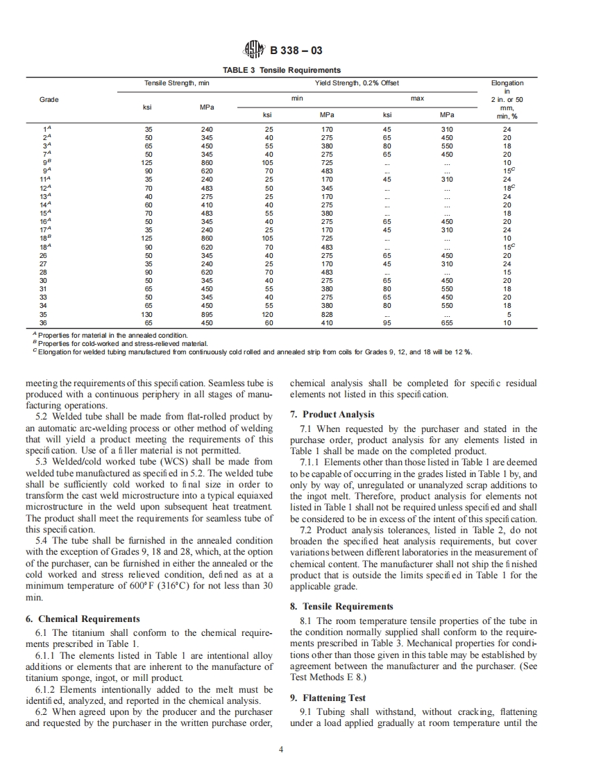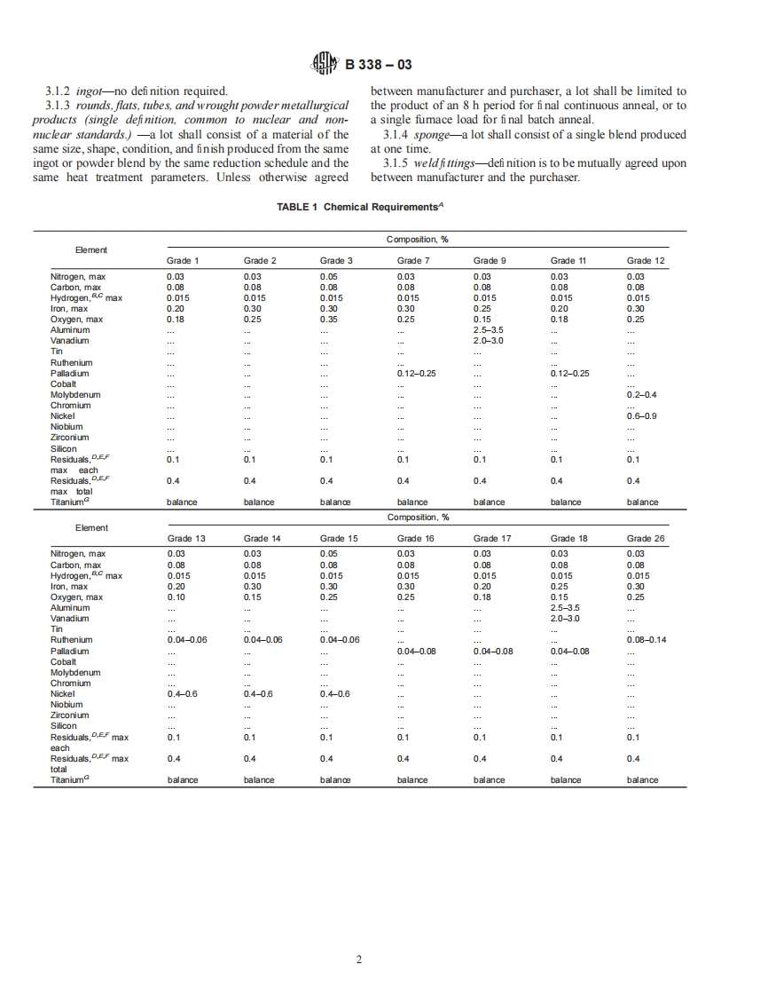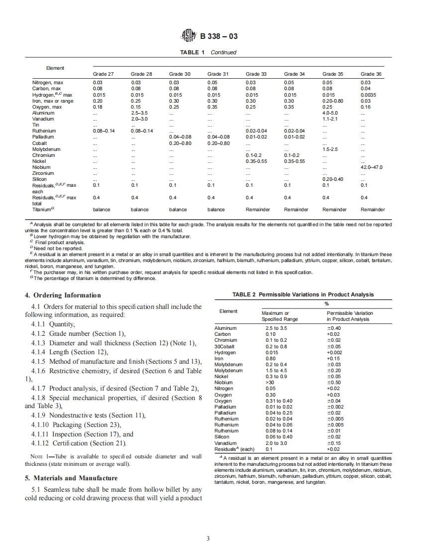 Designation:B 338-03INTERNATIONALStandard Specification forSeamless and Welded Titanium and Titanium Alloy Tubesfor Condensers and Heat Exchangers'This standard is issued under the fixed designation B 338;the number immediately following the designation indicates the year oforiginal adoption or,in the case of revision,the year of last revision.A number in parentheses indicates the year of last reapproval.Asuperscript epsilon (E)indicates an editorial change since the last revision or reapproval.This standard has been approved for use by agencies of the Department of Defense.1.Scope1.1.17 Grade 30-Titanium alloy (0.3 cobalt,0.05%1.1 This specifi cation2 covers the requirements for 22palladium),grades of titanium and titanium alloy tubing intended for1.1.18 Grade 3/-Titanium alloy (0.3 cobalt,0.05%surface condensers,evaporators,and heat exchangers,as fol-palladium),lows:1.1.19 Grade 33-Titanium alloy (0.4%nickel,0.015%1.1.1 Grade 1-Unalloyed titanium,palladium,0.025 ruthenium,0.15 chromium),1.1.2 Grade 2-Unalloyed titanium,1.1.20 Grade 34-Titanium alloy (0.4 nickel,0.015%1.1.3 Grade 3-Unalloyed titanium,palladium,0.025 ruthenium,0.15 chromium),1.1.4 Grade 7-Unalloyed titanium plus 0.12 to 0.251.1.21 Grade 35-Titanium alloy (4.5 aluminum,2%palladium,molybdenum,1.6%vanadium,0.5 iron,0.3 silicon),and1.1.5 Grade 9-Titanium alloy (3%aluminum,2.5 va-1.1.22 Grade 36-Titanium alloy (45%niobium).nadium),1.2 Tubing covered by this specifi cation shall be heat treated1.1.6 Grade 1/-Unalloyed titanium plus 0.12 to 0.25by at least a stress relief as defi ned in 5.3.palladium,1.3 The values stated in inch-pound units are to be regarded1.1.7 Grade 12-Titanium alloy (0.3%molybdenum,as the standard.The values given in parentheses are for0.8 nickel),information only1.1.8 Grade 13-Titanium alloy (0.5 nickel,0.05%ru-thenium),2.Referenced Documents1.1.9 Grade 14-Titanium alloy (0.5 nickel,0.05 ru-2.1 ASTM Standards:3thenium),A 370 Test Methods and Defi nitions for Mechanical Testing1.1.10 Grade 15-Titanium alloy (0.5 nickel,0.05of Steel Productsruthenium).E8 Test Methods for Tension Testing of Metallic Materials1.1.11 Grade /6-Unalloyed titanium plus 0.04 to 0.08E29 Practice for Using Signifi cant Digits in Test Data topalladium,Determine Conformance with Specif cations1.1.12 Grade /7-Unalloyed titanium plus 0.04 to 0.08E 120 Test Methods for Chemical Analysis of Titanium andpalladium,Titanium Alloys1.1.13 Grade 18Titanium alloy (3%aluminum,2.5E 1409 Test Method for Determination of Oxygen in Tita-vanadium)plus 0.04 to 0.08%palladium,nium and Titanium Alloys by the Inert Gas Fusion Tech-1.1.14 Grade 26-Unalloyed titanium plus 0.08 to 0.14niqueruthenium.E1447 Test Method for Determination of Hydrogen in1.1.15 Grade 27-Unalloyed titanium plus 0.08 to 0.14Titanium and Titanium Alloys by the Inert Gas FusionrutheniumThermal Conductivity Method1.1.16 Grade 28-Titanium alloy (3 aluminum,2.53.Terminologyvanadium)plus 0.08 to 0.14%ruthenium,3.1 Lot Definitions:3.1.1 castings-a