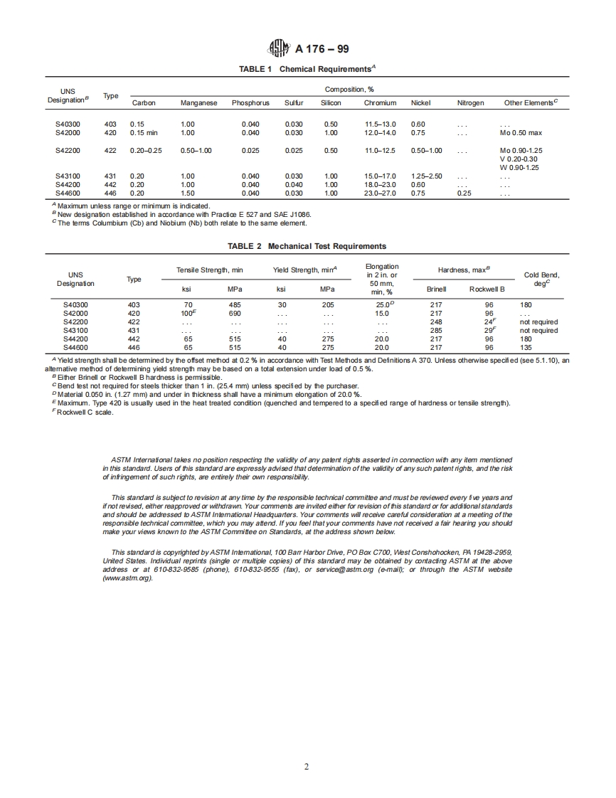 Designation:A 176-99NTERNATIONALStandard Specification forStainless and Heat-Resisting Chromium Steel Plate,Sheet,and Strip1This standard is issued under the fixed designationA 176;the number immediately ollowing the designation indicates the year oforiginal adoption or,in the case of revision,the year of last revision.A number in parentheses indicates the year of last reapproval.Asuperscript epsilon (e)indicates an editorial change since the last revision or reapproval.This standard has been approved for use by agencies of the Department of Defense.1.Scope3.Chemical Composition1.1 This specifi cation covers stainless and heat-resisting3.1 The steel shall conform to the requirements as tochromium steel plate,sheet,and strip available in a widechemical composition specified in Table 1,and shall conformvariety of surface fi nishes.to applicable requirements specifi ed in Specifi cation A 480/1.2 The values stated in inch-pound units are to be regardedA480Mas the standard.4.Mechanical PropertiesNorE 1-Grades that were previously covered in both Specifi cationsA 176 and A 240/A 240M have been removed from this specifi cation and4.1 The material shall conform to the mechanical propertiesmay now be supplied and purchased in compliance with Specifi cationspecified in Table 2.A 240/A 240M.The chemical and mechanical property requirements ofthese grades were identical in Specifications A 176 and A 240/A 240M at5.General Requirementsthe time of removal from Specifi cation A 176.5.1 The following requirements for orders for material2.Referenced Documentsfurnished under this specifi cation shall conform to the appli-cable requirements of the current edition of Specifi cation2.1 ASTM Standards:A480/A480M.A 240/A240M Specifi cation for Heat-Resisting Chromium5.1.1 Defi nitions,and Chromium-Nickel Stainless Steel Plate,Sheet and5.1.2 General requirements for delivery,Strip for Pressure Vessels25.1.3 Ordering information,A 370 Test Methods and Defi nitions for Mechanical Testing5.1.4 Process.of Steel Products25.1.5 Special tests,A 480/A480M Specifi cation for General Requirements for5.1.6 Heat treatment,Flat-Rolled Stainless and Heat-Resisting Steel Plate,5.1.7 Dimensions and permissible variations,Sheet,and Strip-5.1.8 Workmanship,fi nish and appearance,E 527 Practice for Numbering Metals and Alloys (UNS)35.1.9 Number of tests/test methods,2.2 SAE Standard:5.1.10 Specimen preparation,J1086 Practice for Unified Numbering for Metals and Al-5.1.11 Retreatment,loys(UNS)45.1.12 Inspection,5.1.13 Rejection and rehearing,This specifi cation is under the jurisdiction ofASTM Committee A-1 on Steel,5.1.14 Material test report,andStainless Steel and Related Alloysand is the direct responsibility of Subcommitiee5.1.15 Certifi cation.A01.17 on Flat Stainless Steel Products.Current edition approved Sept.10,1999.Published November 1999.Originallypublished as A 176-35 T.Last previous edition A 176-97.2Annual Book of ASTM Standards,Vol 01.03.3 Annual Book of ASTM Standards,Vol